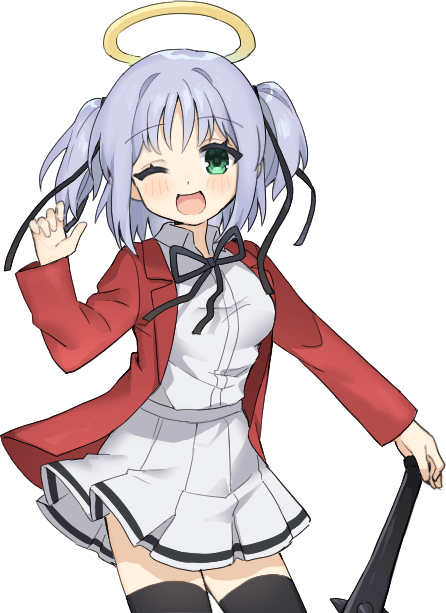 1girl black_thighhighs bokusatsu_tenshi_dokuro-chan club_(weapon) eguegukun green_eyes hair_tie halo jacket mitsukai_dokuro neck_ribbon one_eye_closed open_clothes open_jacket open_mouth red_jacket ribbon shirt simple_background skirt thighhighs traditional_halo two_side_up weapon white_shirt white_skirt yellow_halo