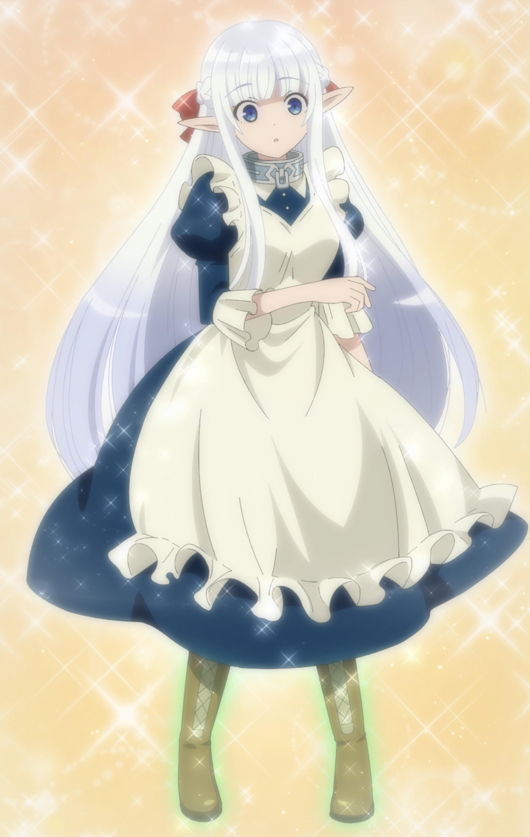 absurdres anime_screenshot blue_eyes boots elf highres long_hair maid maou_no_ore_ga_dorei_elf_wo_yome_ni_shitanda_ga_dou_medereba_ii? nephelia pointy_ears stitched thigh_boots third-party_edit white_hair