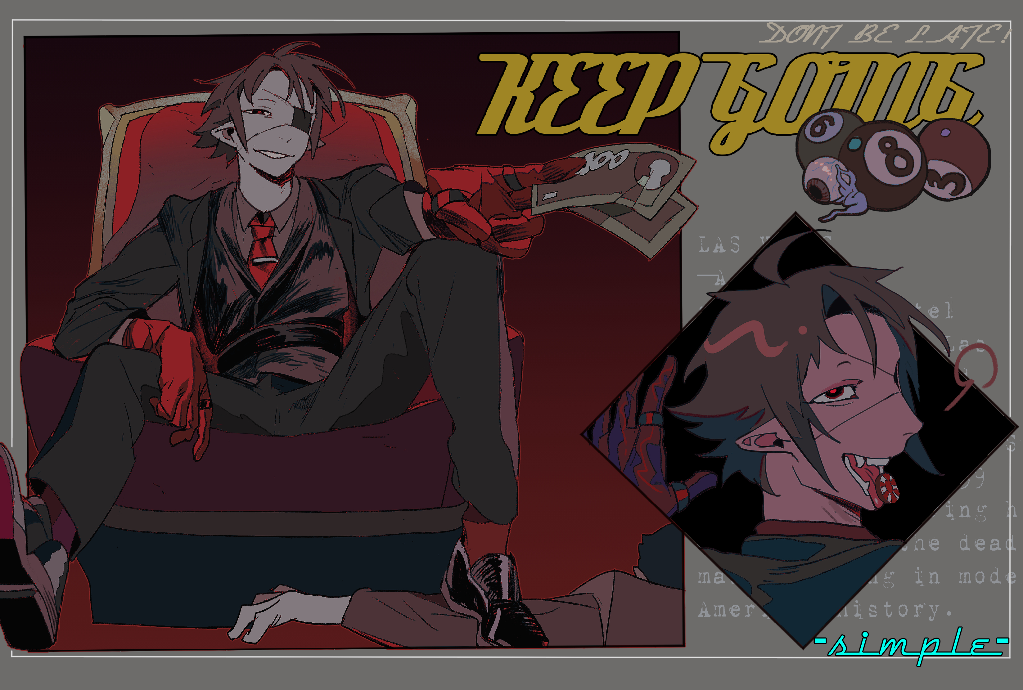2boys absurdres ahoge ball banknote billiard_ball black_eyes black_jacket black_pants black_suit brown_hair brown_shirt chair chinese_commentary collared_shirt commentary_request english_text eyepatch fangs formal_clothes gloves gradient_background grey_background grin hand_up highres holding holding_money jacket jewelry looking_at_viewer male_focus money multiple_boys multiple_rings multiple_views necktie open_mouth original pants pointy_ears red_background red_gloves red_necktie red_pupils red_socks ring shirt shoes short_hair sitting smile socks solo_focus suit tongue tongue_out yulei_yuuuuu
