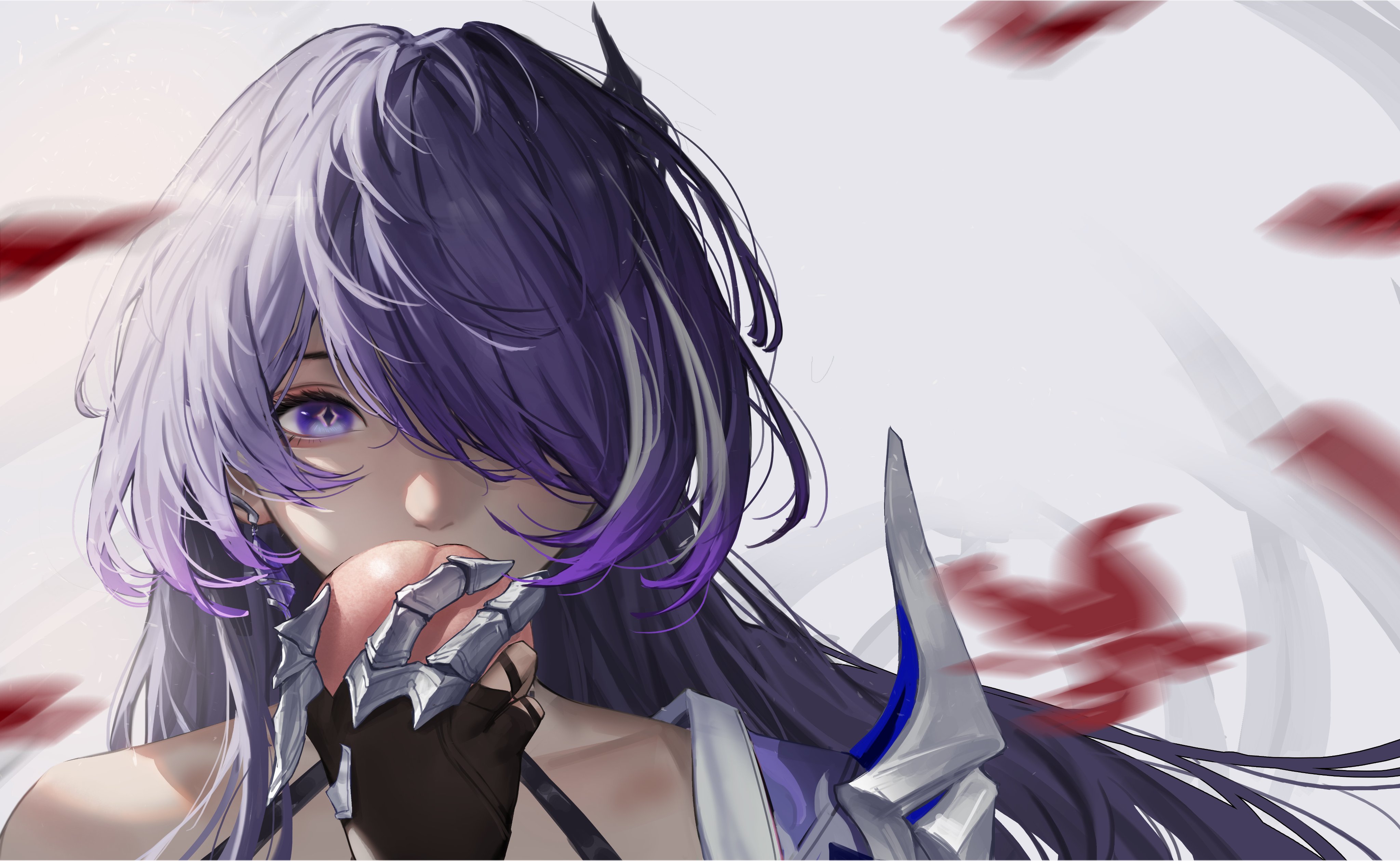 1girl absurdres acheron_(honkai:_star_rail) black_gloves bone coat detached_sleeves earrings eating falling_petals food fruit gloves goldenfish hair_over_one_eye highres holding holding_food holding_fruit honkai:_star_rail honkai_(series) jewelry long_hair multicolored_hair peach petals purple_eyes purple_hair single_bare_shoulder single_earring skeleton solo streaked_hair white_coat