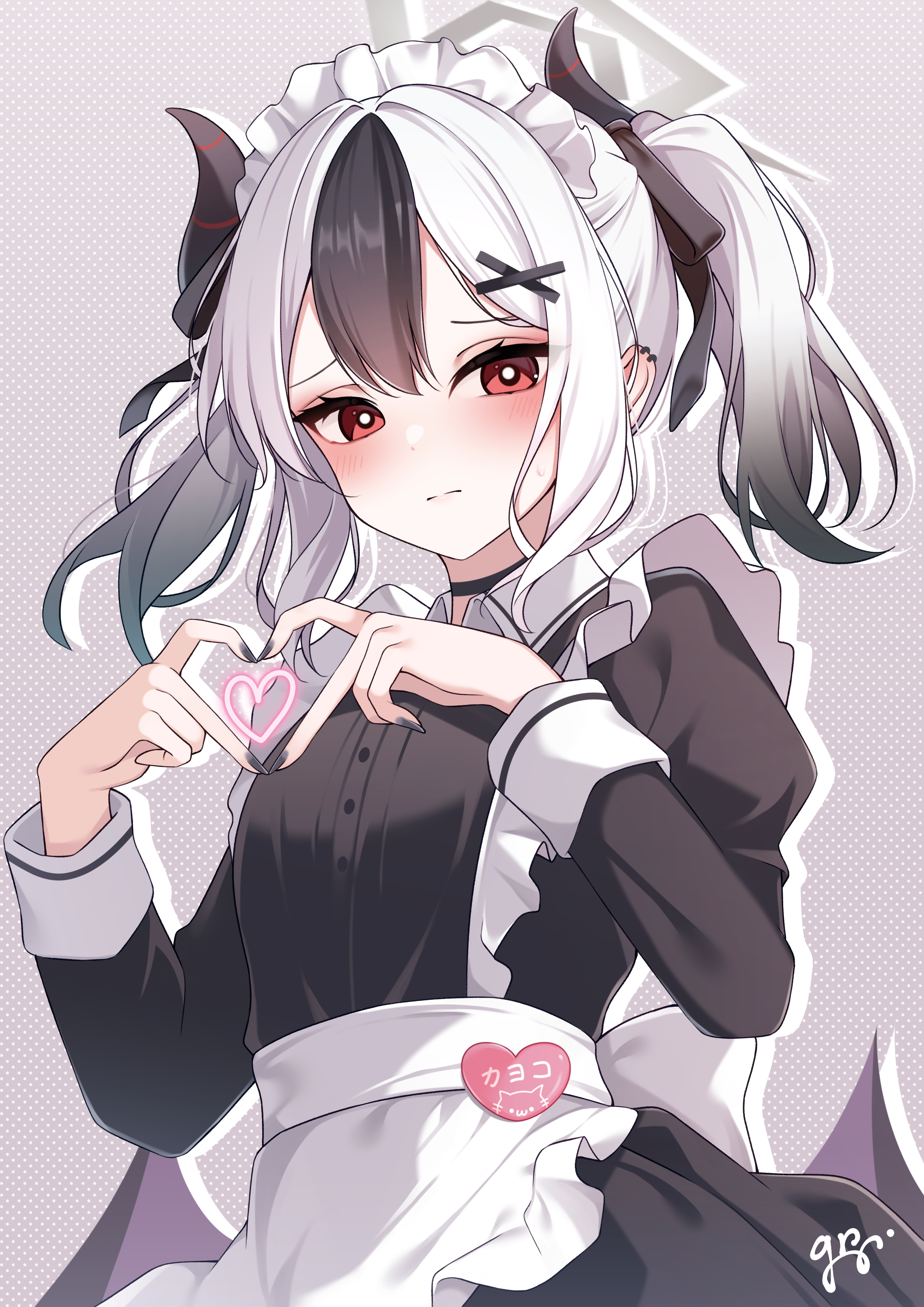 1girl absurdres alternate_costume alternate_hairstyle apron black_choker black_hair black_nails black_ribbon blue_archive blush bright_pupils character_name choker closed_mouth commentary_request cowboy_shot double-parted_bangs enmaided eyelashes frilled_apron frills frown grey_background grey_halo guri_(gri1211) hair_between_eyes hair_ornament hair_ribbon halo hands_up heart heart_hands highres juliet_sleeves kayoko_(blue_archive) long_hair long_sleeves looking_at_viewer maid maid_apron maid_headdress multicolored_hair nail_polish polka_dot polka_dot_background puffy_sleeves red_eyes ribbon shy signature simple_background solo split_mouth sweatdrop tsurime twintails two-tone_hair white_apron white_hair white_pupils x_hair_ornament