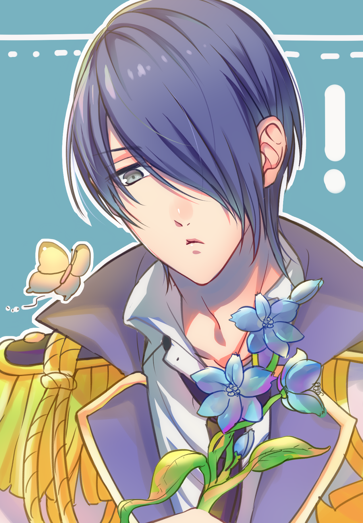 ! 1boy ayakura_azuma blue_background bug butterfly epaulettes flower frown grey_eyes hair_over_one_eye highres holding holding_flower insect magic-kyun!_renaissance male_focus portrait school_uniform solo suminomiya_aoi upper_body