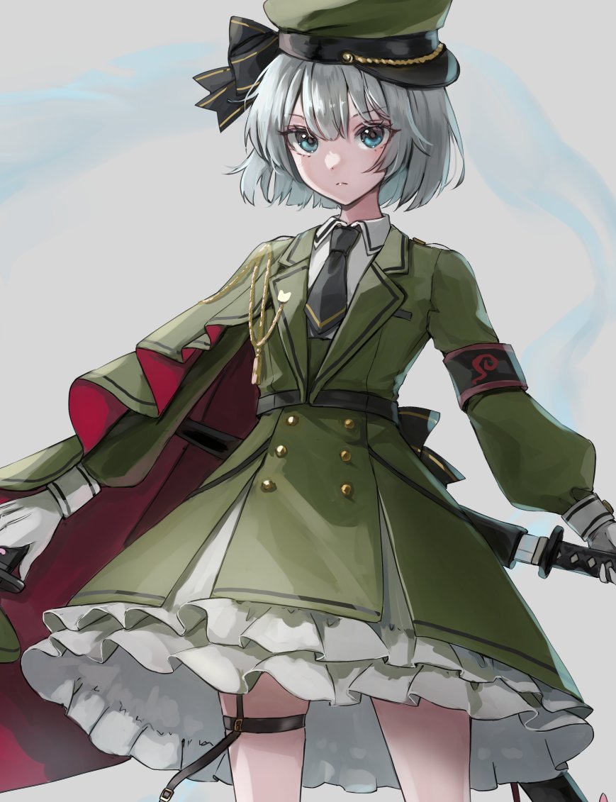 1girl adapted_costume armband black_armband black_necktie blue_eyes gloves green_jacket jacket konpaku_youmu konpaku_youmu_(ghost) lolita_fashion looking_at_viewer military_lolita military_uniform necktie serious shironeko_yuuki shirt short_hair solo sword thighs touhou weapon white_gloves white_hair white_shirt youmu_day