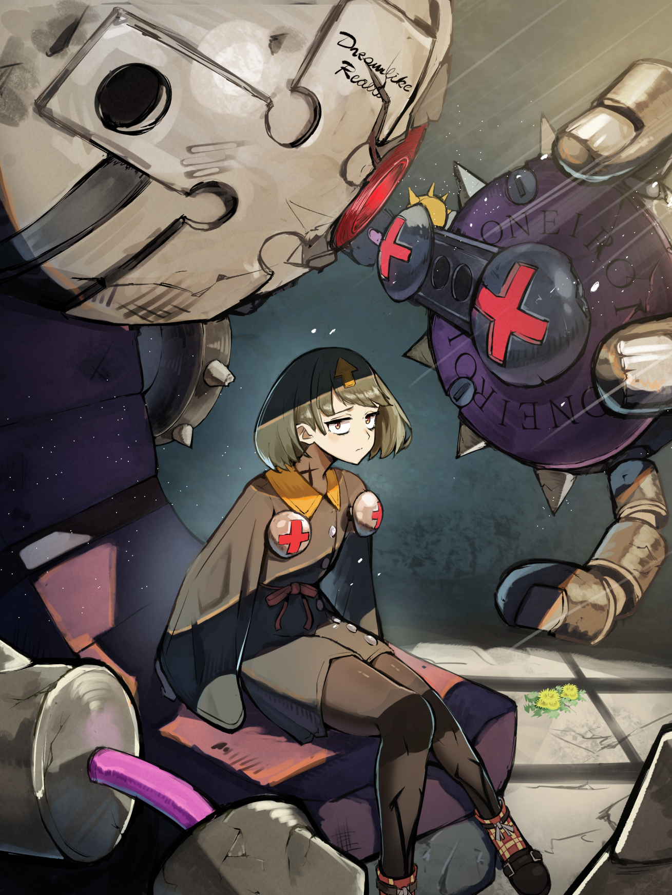1girl arrow_(symbol) arrow_hair_ornament bags_under_eyes bedman? black_dress black_pantyhose bolt_(hardware) delilah_(guilty_gear) dress green_hair guilty_gear guilty_gear_strive highres long_sleeves looking_at_viewer mechanical_arms non-humanoid_robot osashimi_0343x pantyhose robot screw short_hair sitting yellow_eyes
