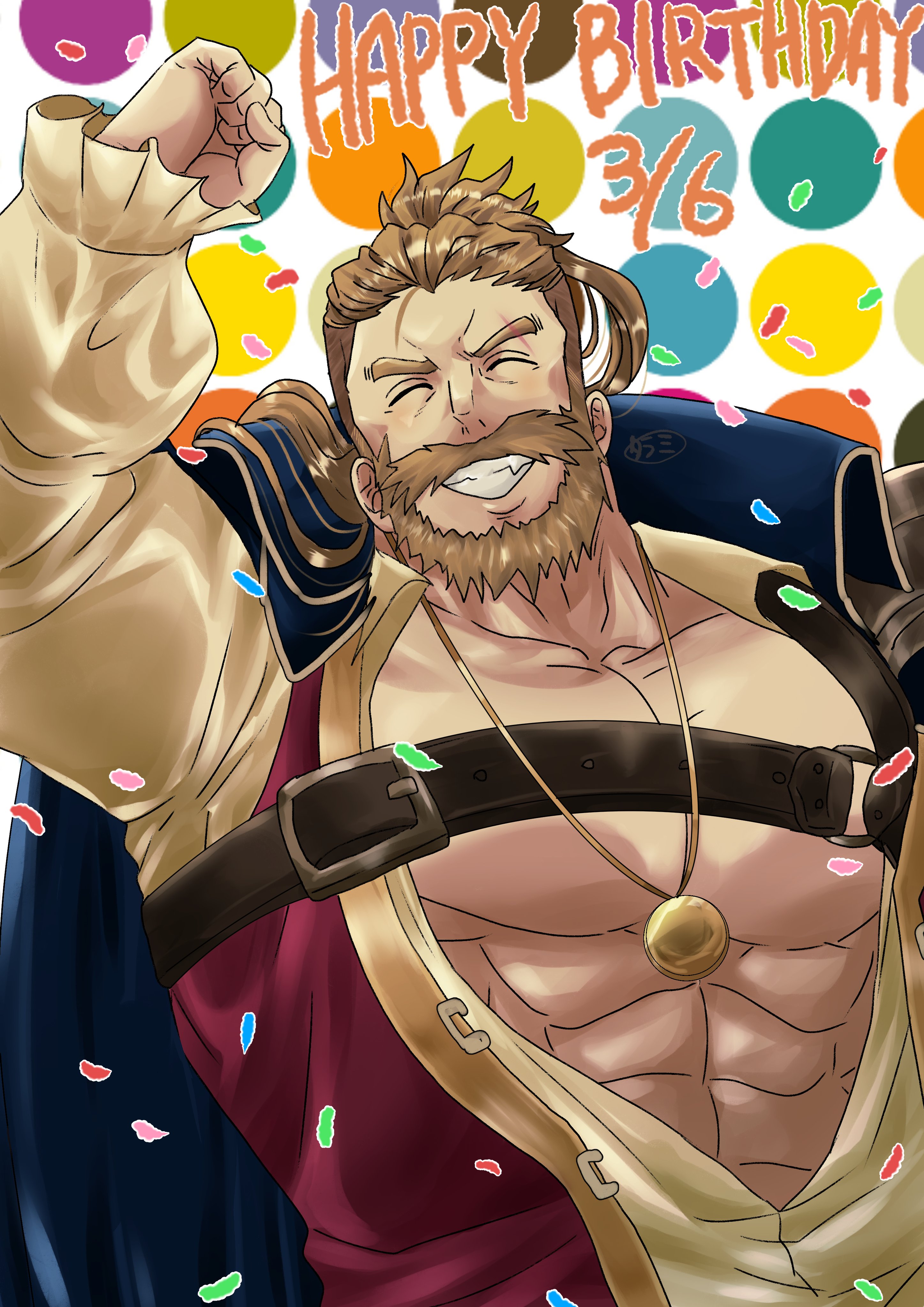 1boy abs absurdres arm_up bara beard bergamond_(crave_saga) chest_hair closed_eyes crave_saga dated eyebrow_cut facial_hair happy_birthday highres jewelry large_pectorals long_hair male_focus mature_male muscular muscular_male mustache necklace open_clothes pectorals polka_dot polka_dot_background pon_tarami ponytail smile solo thick_eyebrows thick_mustache