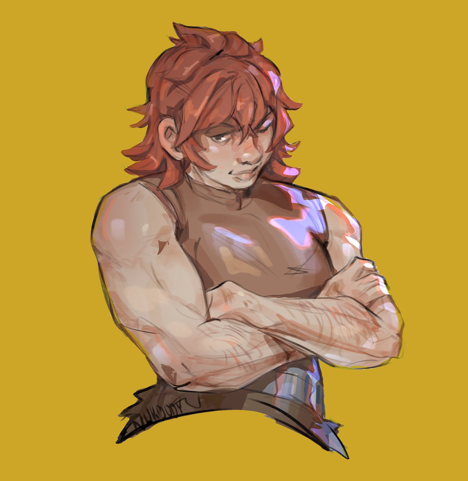1girl armor artist_name dungeon_meshi dwarf highres leather_armor looking_at_viewer muscular muscular_female namari_(dungeon_meshi) nukbody pelt red_hair short_hair smile strong yellow_background
