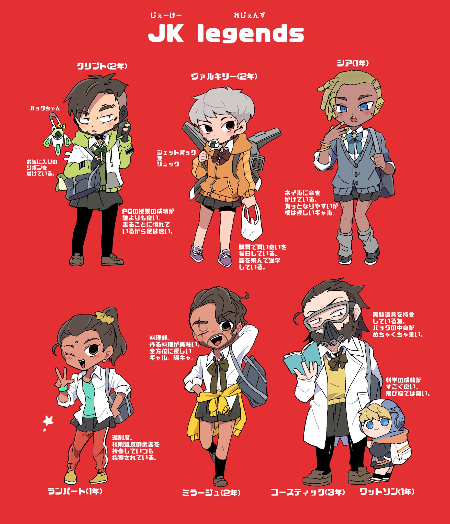 3girls 4boys animification apex_legends bag beard black_eyes black_pantyhose black_skirt blonde_hair blue_cardigan blue_eyes blue_shirt blush book bow bracelet brown_eyes brown_hair cardigan caustic_(apex_legends) collared_shirt crossdressing crypto_(apex_legends) dark-skinned_female dark-skinned_male dark_skin dreadlocks facial_hair facial_mark forehead_mark goatee goggles grey_hair hack_(apex_legends) hair_slicked_back highres holding holding_bag holding_book hood hoodie jetpack jewelry looking_at_viewer looking_down mirage_(apex_legends) missile_pod multiple_boys multiple_girls nojima_minami non-humanoid_robot orange_hoodie pants pantyhose rampart_(apex_legends) red_background red_bow red_pants robot sanpaku school_uniform seer_(apex_legends) shirt short_hair side_ponytail skirt track_pants translation_request v valkyrie_(apex_legends) wattson_(apex_legends)