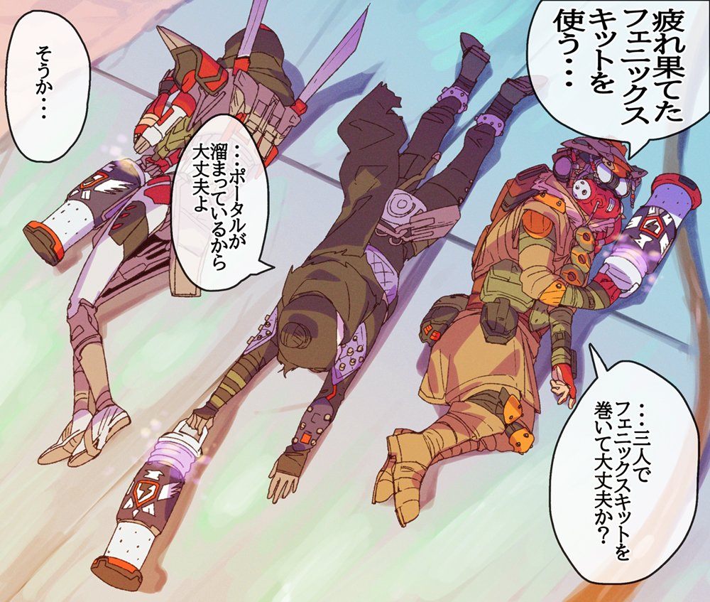 1boy 1girl 1other ambiguous_gender animification apex_legends black_bodysuit black_gloves black_scarf bloodhound_(apex_legends) bodysuit brown_footwear brown_jacket cable gloves goggles humanoid_robot jacket lying mizu_cx on_side on_stomach rebreather red_gloves revenant_(apex_legends) robot scarf simulacrum_(titanfall) speech_bubble translation_request wraith_(apex_legends)