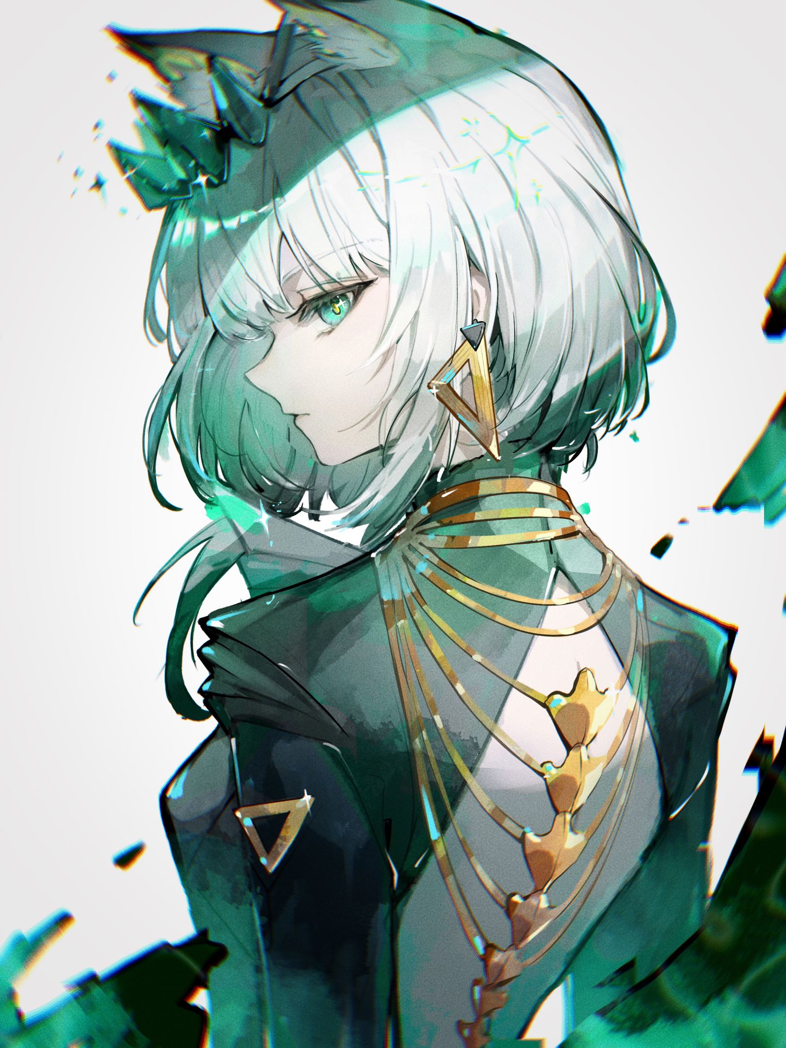 1girl ambience_synesthesia animal_ear_fluff animal_ears arknights backless_dress backless_outfit black_dress cat_ears commentary_request dress earrings green_eyes highres jewelry kal'tsit_(ambience_synesthesia)_(arknights) kal'tsit_(arknights) long_sleeves looking_at_viewer looking_back necklace short_hair simple_background solo tency_(1733djy) tiara triangle_earrings upper_body white_background white_hair