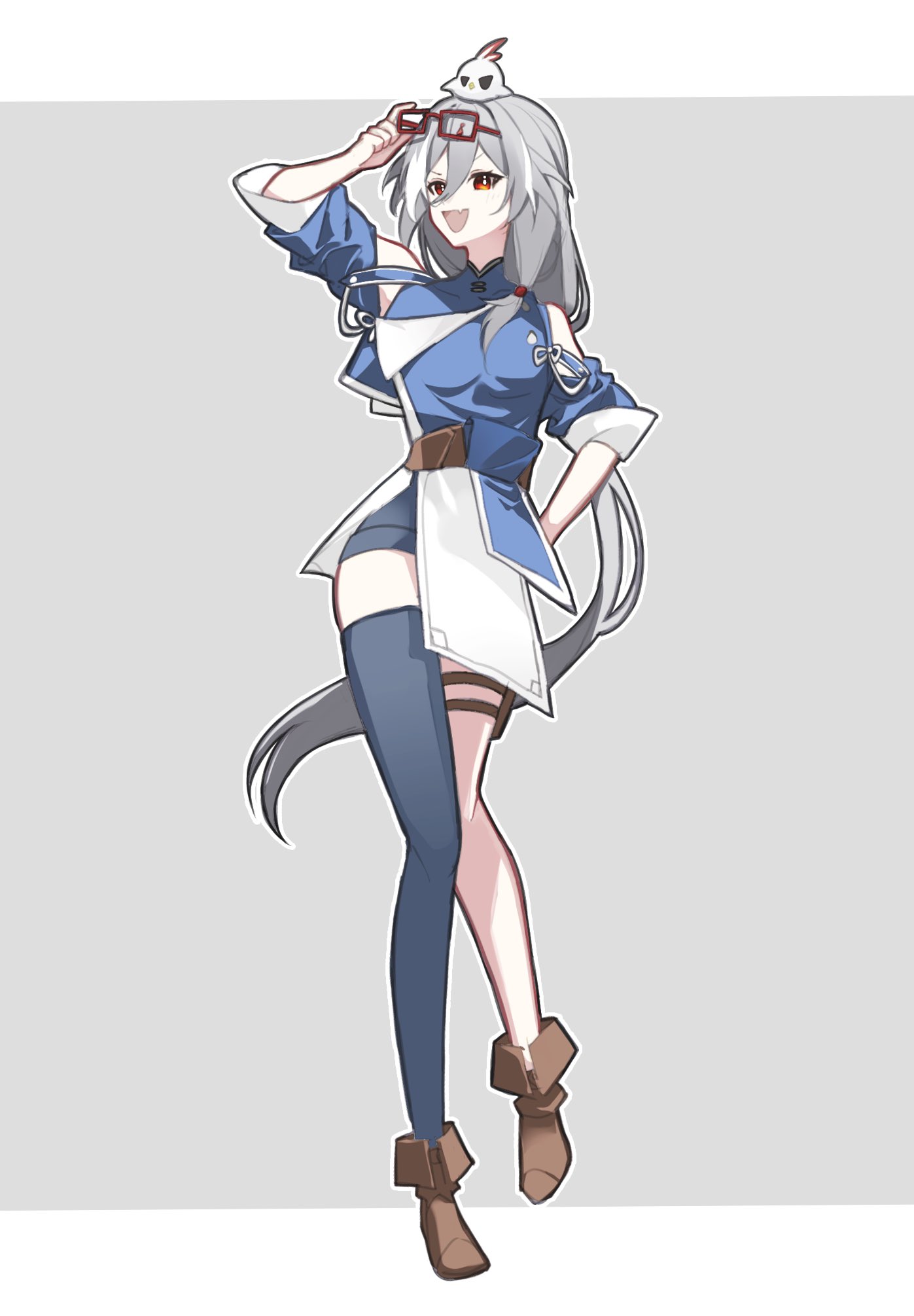 1girl :d adapted_costume black_thighhighs blue_jacket boots brown_boots brown_shorts cosplay fang fu_hua herrscher_of_sentience fu_hua_(valkyrie_accipiter) fu_hua_(valkyrie_accipiter)_(cosplay) full_body glasses grey_background grey_hair highres holding holding_removed_eyewear honkai_(series) honkai_impact_3rd jacket jingwei_(bird) long_hair looking_at_viewer nuta_h3 on_head open_mouth red_eyes shorts single_thighhigh skin_fang smile solo thighhighs two-tone_background unworn_eyewear v-shaped_eyebrows very_long_hair white_background