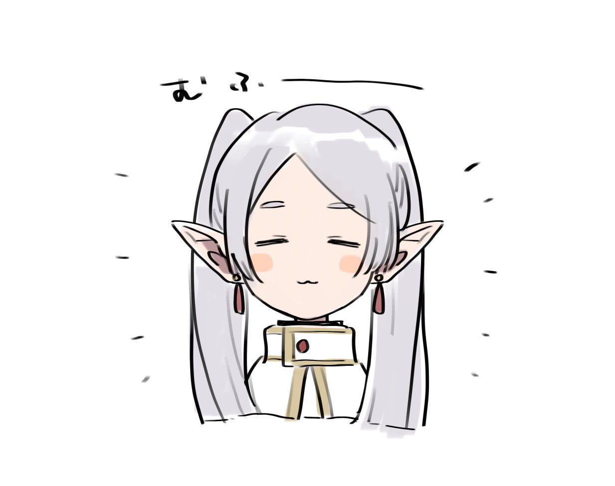 1girl :3 =_= blush_stickers capelet closed_eyes closed_mouth commentary earrings elf frieren grey_hair jewelry long_hair looking_at_viewer pointy_ears solo sousou_no_frieren thick_eyebrows twintails u0oouo upper_body white_capelet