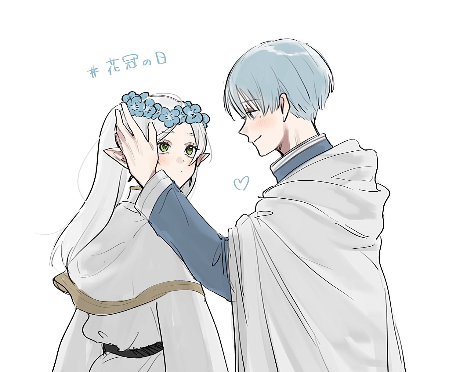 1boy 1girl blue_flower blue_hair blue_jacket blush cape capelet closed_mouth commentary_request dress earrings elf flower frieren green_eyes hand_on_another's_head head_wreath heart hetero highres himmel_(sousou_no_frieren) jacket jewelry long_hair looking_at_viewer mole mole_under_eye pointy_ears short_hair simple_background smile sousou_no_frieren translation_request twintails u0oouo upper_body white_background white_cape white_capelet white_dress white_hair