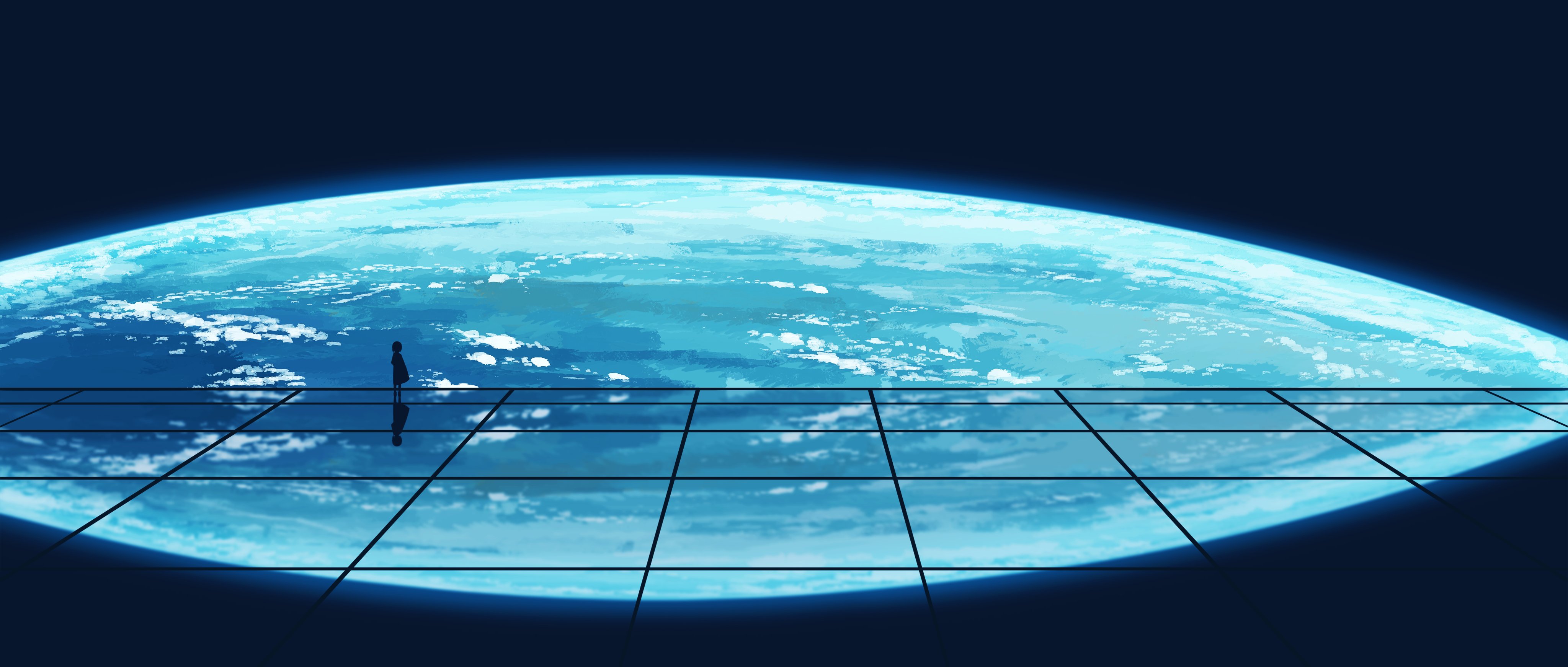 1other absurdres ambiguous_gender atmospheric_layer cloud dress gracile highres original planet reflective_floor scenery short_hair silhouette standing tile_floor tiles very_wide_shot