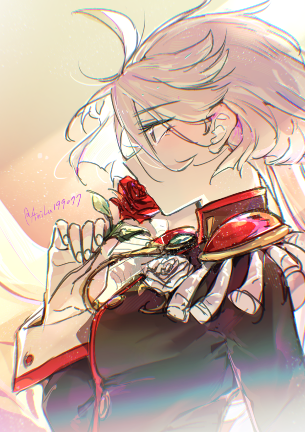 1girl ahoge ani_lu artist_name black_jacket chinese_commentary chromatic_aberration commentary_request cosplay epaulettes flower flower_ornament from_side grey_eyes gundam gundam_suisei_no_majo hair_between_eyes holding holding_flower jacket light_particles long_hair long_sleeves looking_ahead miorine_rembran red_flower red_rose rose shoujo_kakumei_utena sleeve_cuffs solo tenjou_utena tenjou_utena_(cosplay) twitter_username upper_body white_flower white_hair white_rose