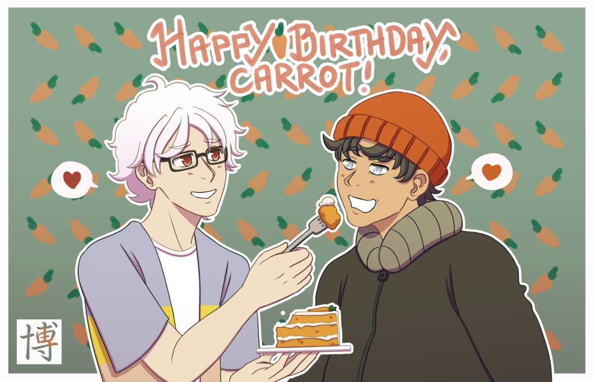 2boys beanie black_hair blue_eyes blue_jacket cake cake_slice feeding food genzou_ichihara glasses hat heart hiro_quaint iggy_maxwell jacket male_focus multiple_boys our_wonderland red_eyes shirt short_hair smile spoken_heart white_hair white_shirt yaoi