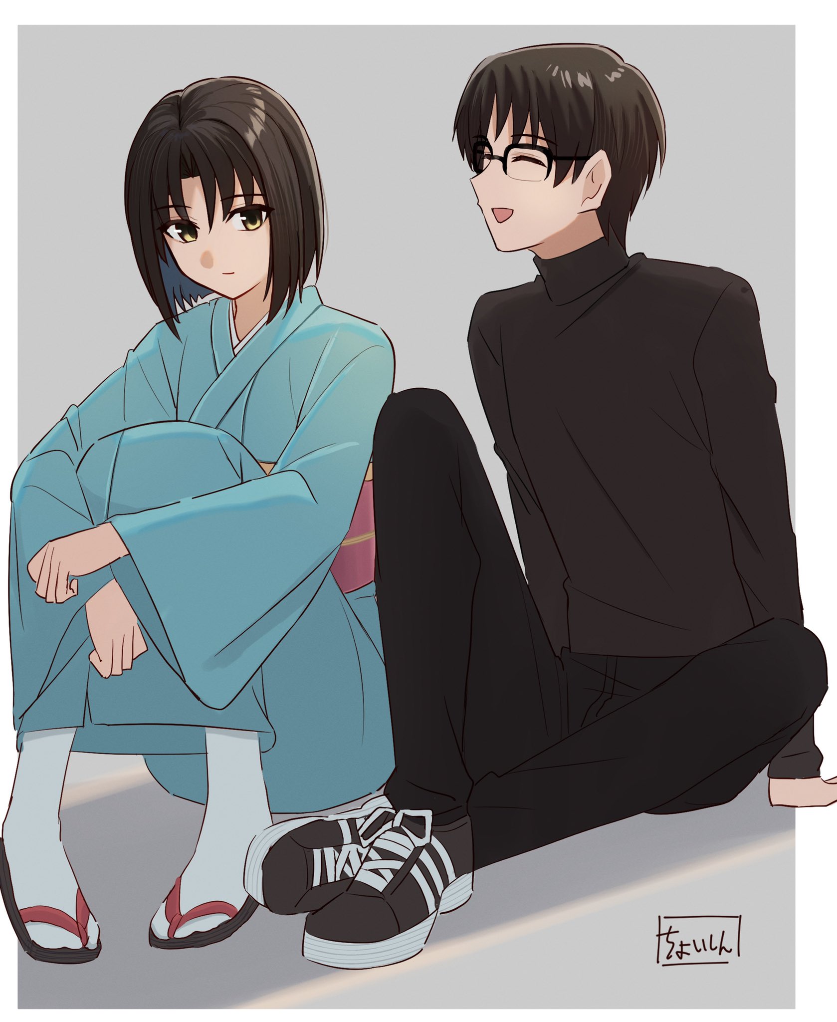 1boy 1girl black-framed_eyewear black_footwear black_pants black_sweater blue_kimono border closed_eyes closed_mouth commentary_request glasses grey_background highres japanese_clothes kara_no_kyoukai kimono kokutou_mikiya long_sleeves looking_at_another looking_to_the_side open_mouth outside_border pants ryougi_shiki sandals shintyoi2 shoes simple_background sitting smile sneakers socks sweater turtleneck turtleneck_sweater white_border white_socks wide_sleeves yellow_eyes