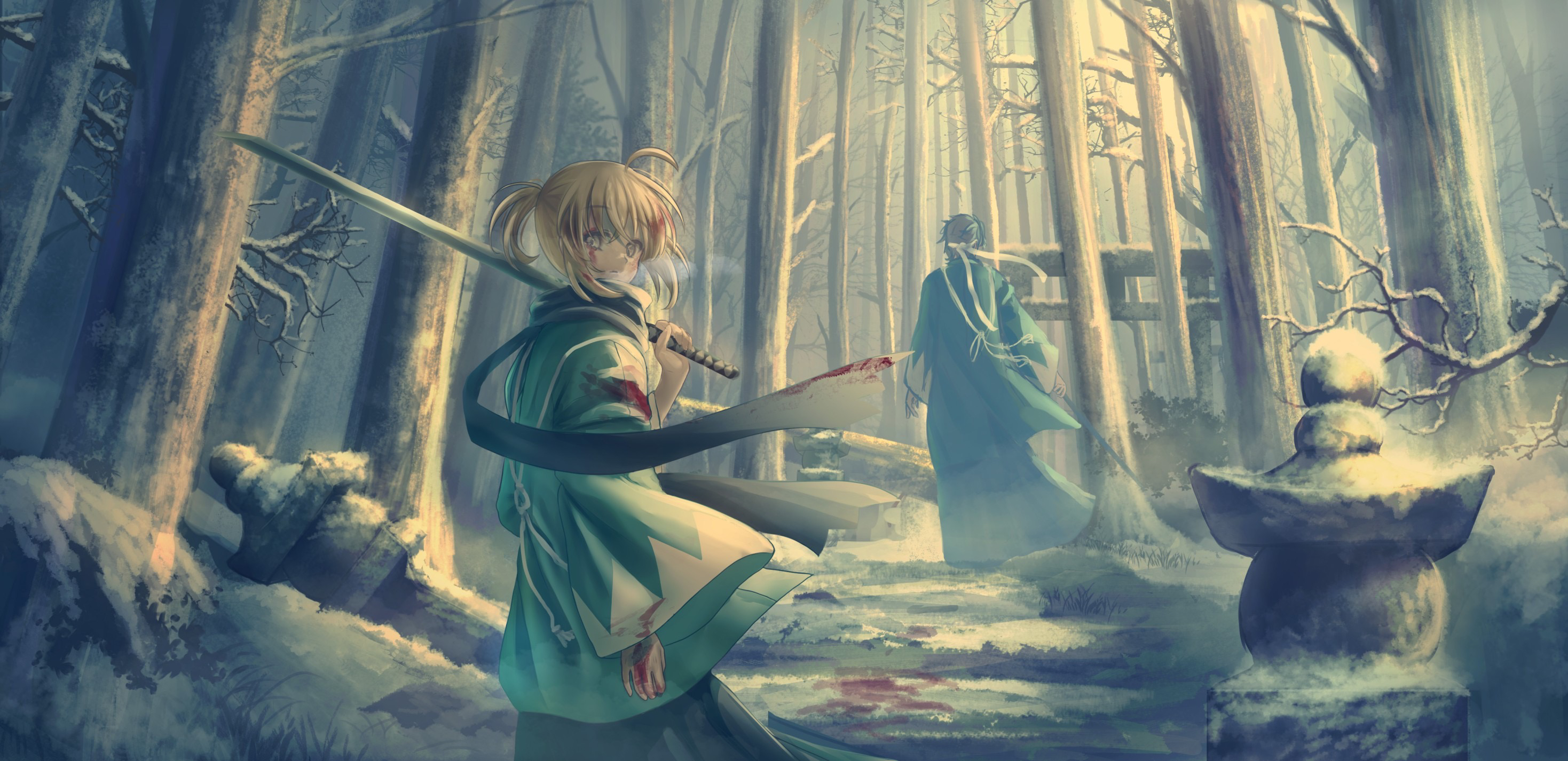 1boy 1girl asagi_futsuka blonde_hair blood blood_in_hair blood_on_clothes blood_on_face blood_on_hands breath character_request expressionless fate/grand_order fate_(series) forest haori highres holding holding_sword holding_weapon japanese_clothes katana kimono koha-ace looking_at_viewer looking_back nature okita_souji_(fate) okita_souji_(koha-ace) okita_souji_(teal_haori_and_hakama)_(fate) outdoors over_shoulder ponytail scarf shinsengumi snow sword sword_over_shoulder torii weapon weapon_over_shoulder winter yellow_eyes