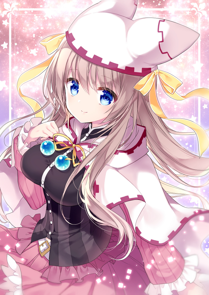 1girl animal_ear_headwear animal_ears arm_at_side belt black_shirt blue_eyes blush breasts brown_hair cape clenched_hand closed_mouth commentary_request commission cowboy_shot fake_animal_ears floating_hair frilled_sleeves frills hair_between_eyes hand_up hat hat_ribbon kotoji large_breasts light_particles long_hair long_sleeves looking_at_viewer magical_girl pink_background pink_skirt pink_sleeves pleated_skirt ribbon sanoba_witch shiiba_tsumugi shirt sidelocks simple_background skeb_commission skirt smile solo split_mouth star_(symbol) straight_hair striped_clothes striped_shirt vertical-striped_clothes vertical-striped_shirt very_long_hair white_belt white_cape white_hat wide_sleeves yellow_ribbon