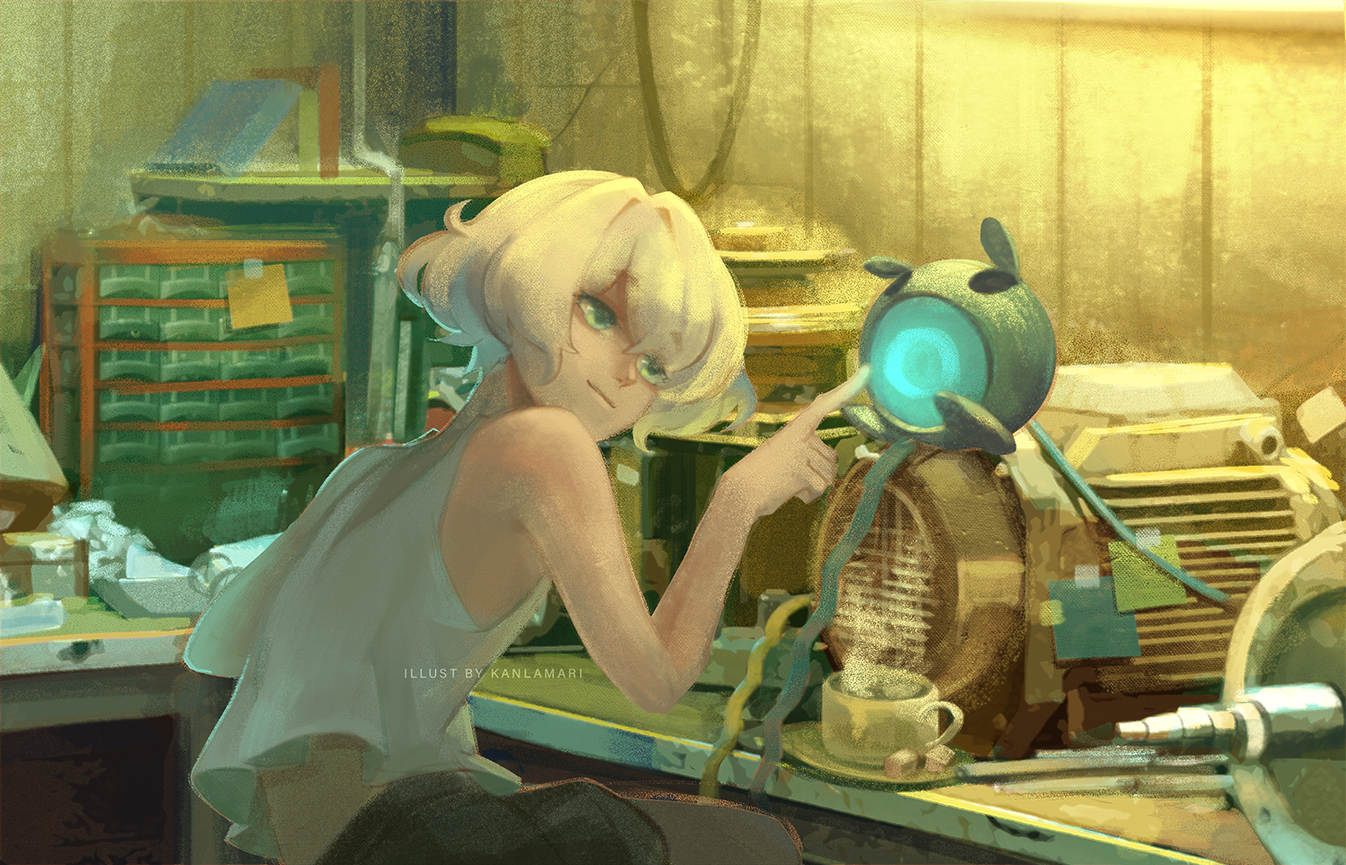 1other androgynous artist_name bare_arms bare_shoulders black_pants blonde_hair blue_eyes cable closed_mouth commentary commentary_request cowboy_shot cup decalcomanica english_commentary english_text from_behind indoors kanlamari light_smile lips looking_at_object machine midriff on_stool original other_focus pants robot saucer short_hair sitting solo steam stool sugar_cube table tank_top tea teacup tiramisu_(kanlamari) watermark white_tank_top workshop
