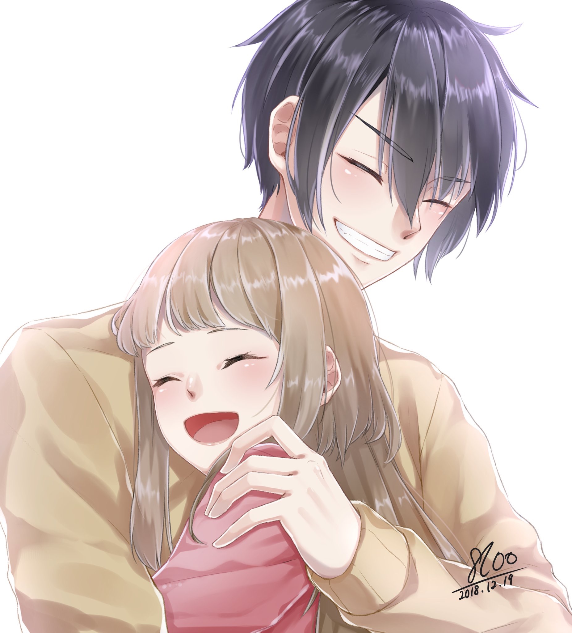 1boy 1girl black_hair blonde_hair closed_eyes couple happy highres hug long_hair open_mouth original pink_shirt shirt short_hair simple_background smile white_background yato_maru