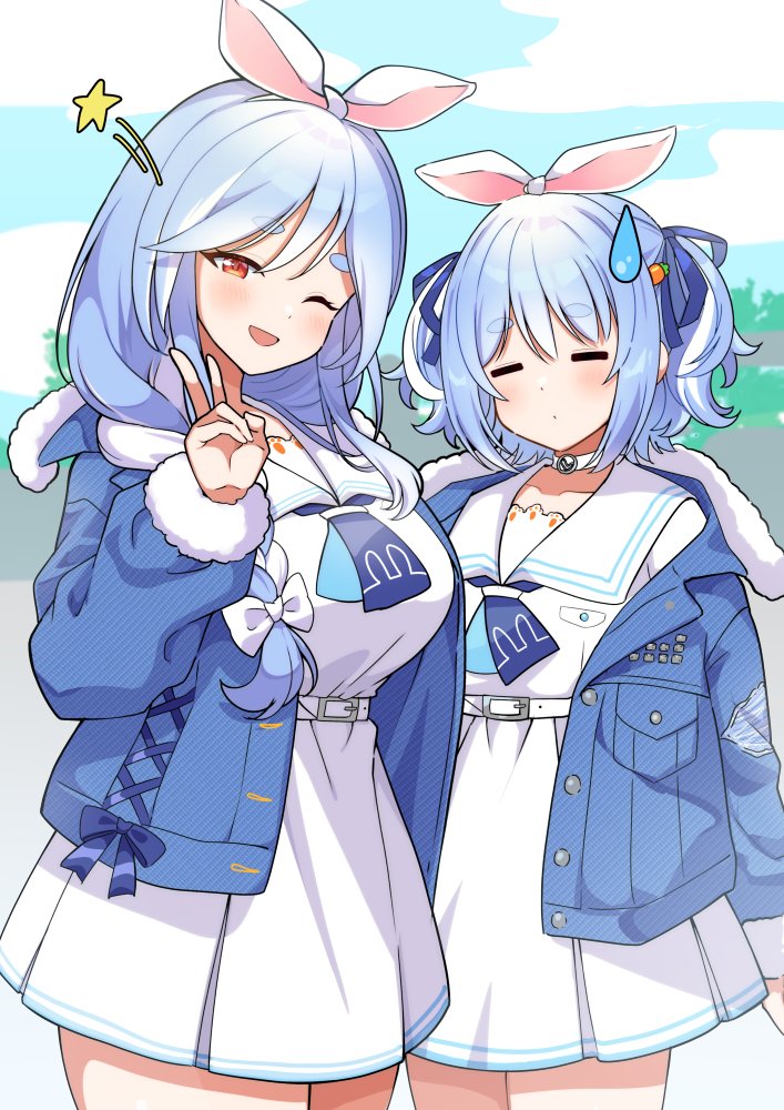 2girls alternate_costume alternate_hairstyle animal_ears blue_hair blue_ribbon blush braid braided_ponytail breasts carrot_hair_ornament choker dress food-themed_hair_ornament hair_ornament hair_ribbon hololive jacket large_breasts long_hair looking_at_viewer mature_female mother_and_child mother_and_daughter multicolored_hair multiple_girls official_alternate_costume parent_and_child pekomama rabbit_ears rabbit_girl red_eyes ribbon sailor_collar short_eyebrows short_hair smile thick_eyebrows torinokawori usada_pekora usada_pekora_(casual) virtual_youtuber white_hair