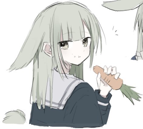 1girl animal_ears bang_dream! bang_dream!_it's_mygo!!!!! carrot closed_mouth cropped_torso eating food food_on_face green_hair holding holding_food kemonomimi_mode long_hair long_sleeves looking_at_viewer lowres rabbit_ears rabbit_girl rabbit_tail saifu_(saihu715) sailor_collar school_uniform serafuku simple_background solo tail tsukinomori_school_uniform upper_body wakaba_mutsumi white_background white_sailor_collar yellow_eyes