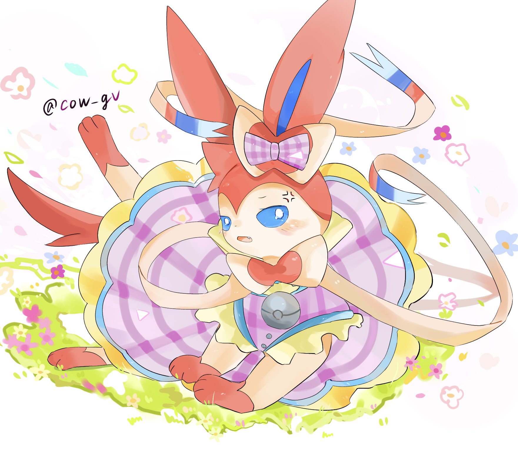 animal_focus bell blue_eyes blush bow cow_gv dress fang flower gen_6_pokemon grass highres nintendo pokemon ribbon solo sylveon twitter_username white_background