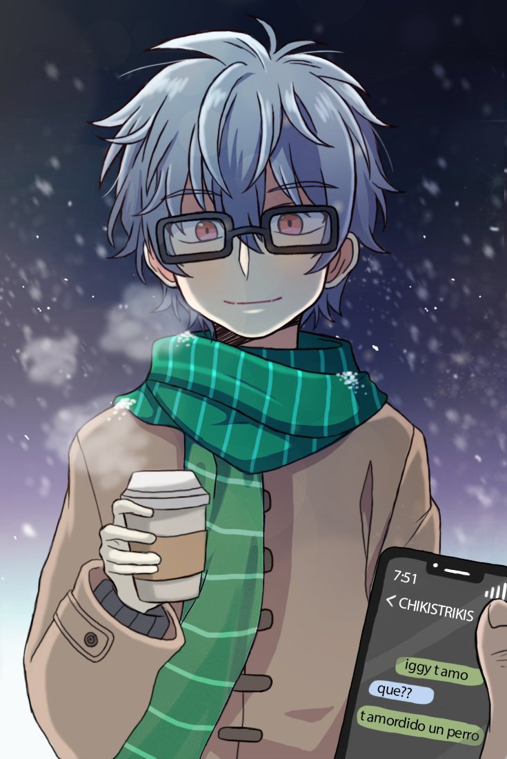 1boy alternate_costume animification breath coffee cup disposable_coffee_cup disposable_cup glasses holding holding_cup iggy_maxwell male_focus our_wonderland outdoors phone red_eyes scarf short_hair snow snowing solo solo_focus spanish_text white_hair winter winter_clothes ximsol182