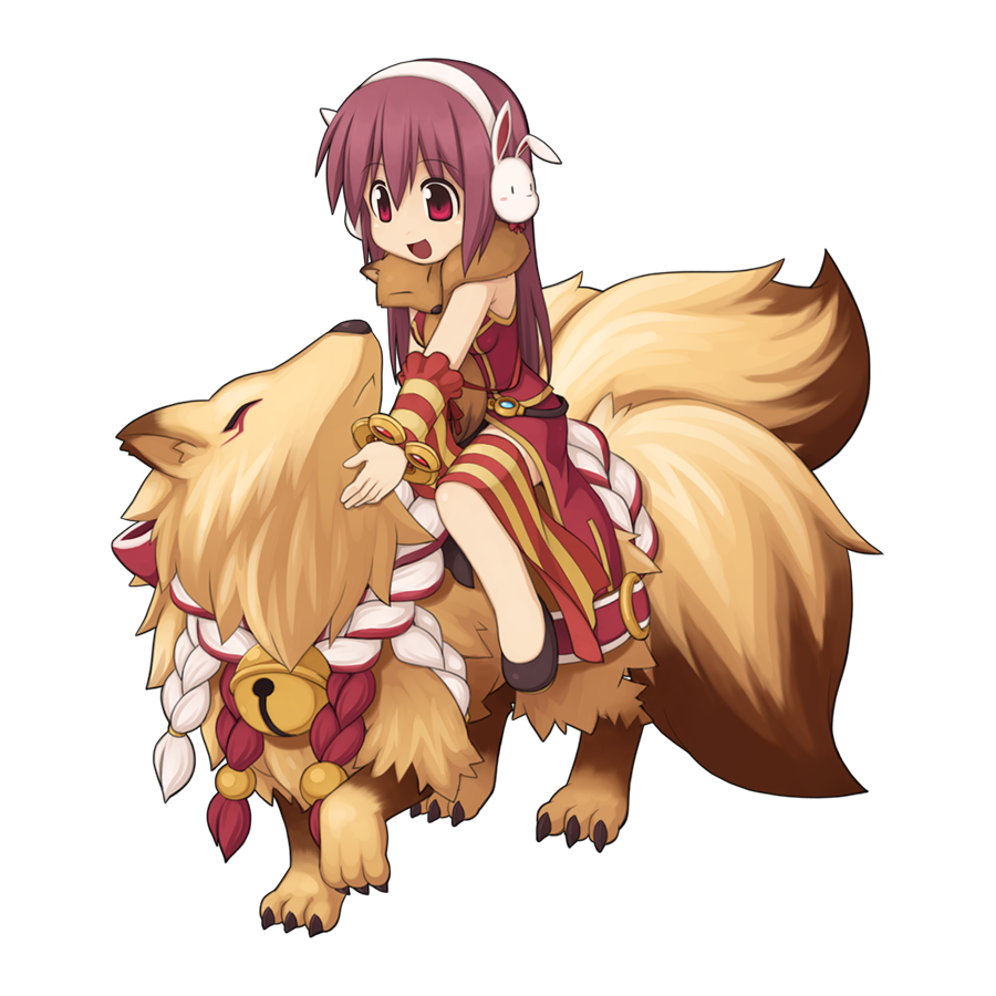 1girl animal animal_around_neck bell black_shoes brown_hair chibi detached_sleeves dress earmuffs fox full_body hair_between_eyes jingle_bell kitsune long_hair multiple_tails official_art open_mouth petting professor_(ragnarok_online) rabbit_earmuffs ragnarok_online red_dress red_eyes red_sleeves riding shoes sidelocks simple_background sleeveless sleeveless_dress smile solo striped_sleeves tail transparent_background yellow_sleeves yuichirou
