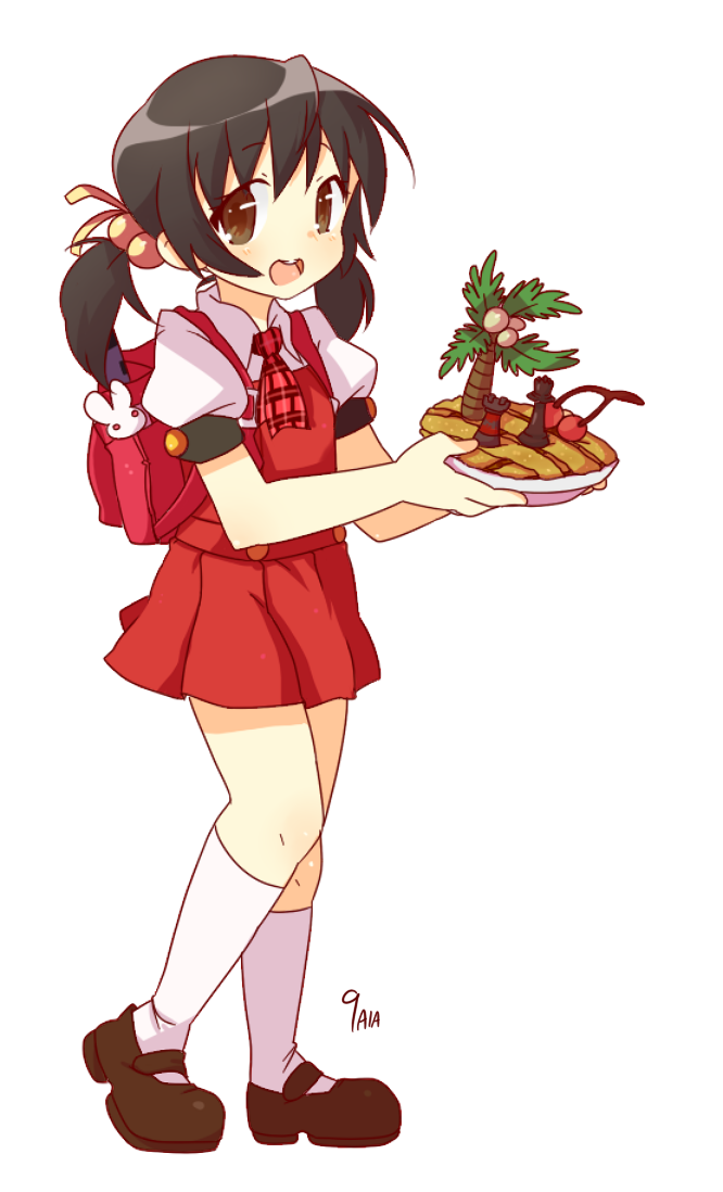 1girl angie_(dranoko) ascot backpack bag black_hair brown_eyes brown_footwear chess_piece collared_shirt commentary commission dress english_commentary food full_body hair_bobbles hair_ornament holding kaai_yuki looking_at_viewer open_mouth pie pinafore_dress plaid_ascot plaid_clothes puffy_short_sleeves puffy_sleeves randoseru red_ascot red_bag red_dress shirt short_sleeves short_twintails simple_background sleeveless sleeveless_dress smile socks solo standing twintails vocaloid white_background white_shirt white_socks