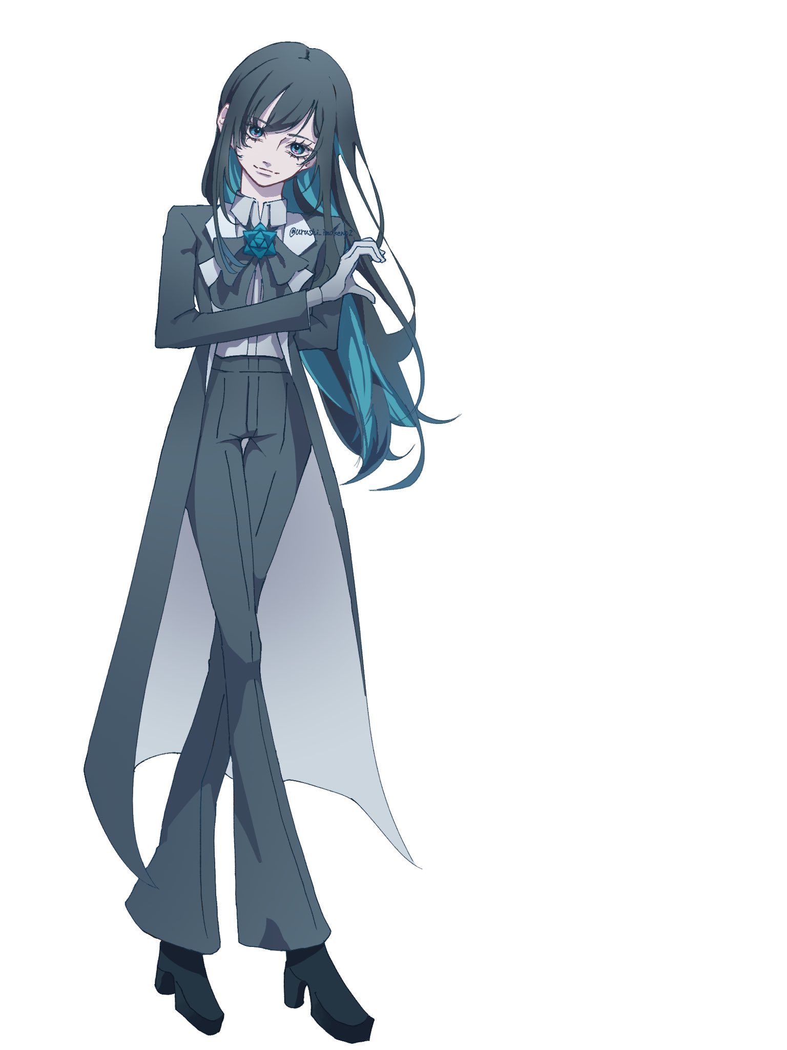 1girl ado_(utaite) black_bow black_bowtie black_coat black_hair black_pants blue_eyes blue_flower blue_hair blue_rose bow bowtie brooch chando_(ado) closed_mouth cloud_nine_inc coat collared_shirt colored_inner_hair commentary_request dress_shirt flower flower_brooch full_body gloves grey_gloves grey_shirt half-heart_hands highres long_hair long_sleeves looking_at_viewer mole mole_under_eye multicolored_hair open_clothes open_coat outline pants rose shirt sidelocks simple_background solo standing twitter_username two-tone_hair urushi_(urushi_art) utaite white_background white_outline