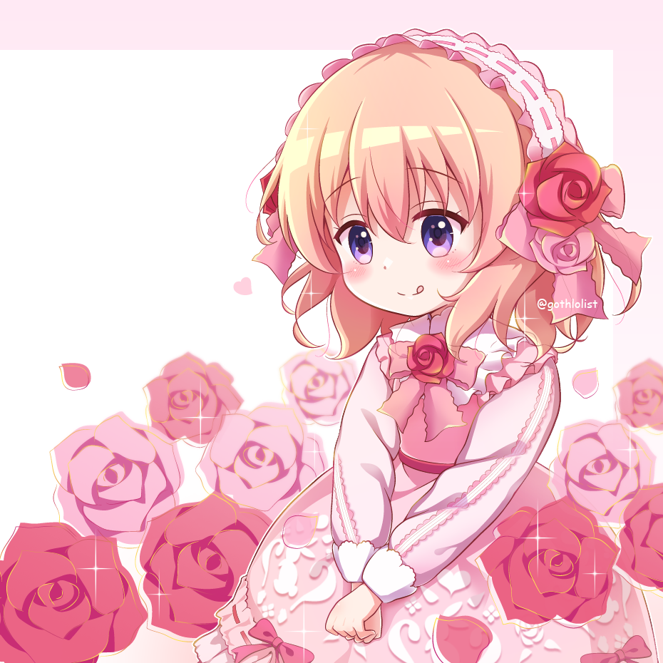 1girl :q blush bow brown_hair closed_mouth dress flower gochuumon_wa_usagi_desu_ka? goth_risuto hair_between_eyes hoto_cocoa lolita_fashion long_sleeves looking_at_viewer pink_background pink_bow pink_dress pink_flower pink_rose puffy_long_sleeves puffy_sleeves purple_eyes red_flower red_rose rose smile solo tongue tongue_out twitter_username two-tone_background white_background