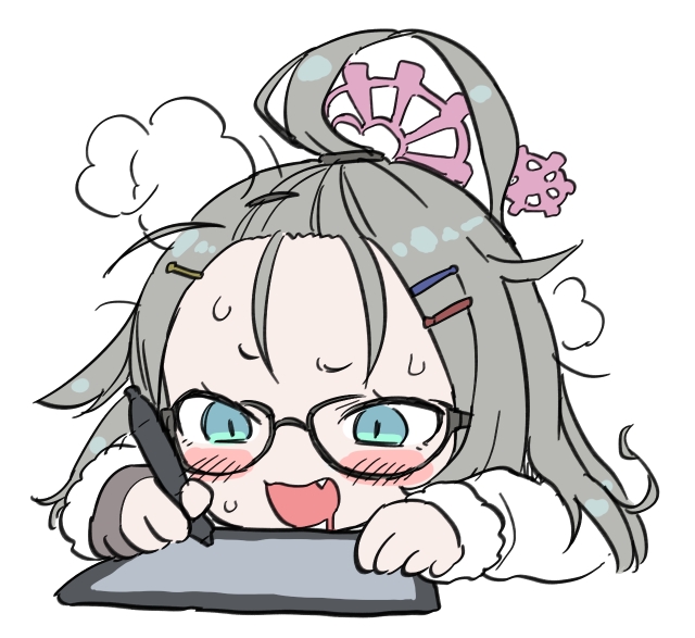 1girl ahoge blue_archive blue_eyes blush drawing_tablet drooling fang forehead glasses grey_hair hair_ornament hairclip halo heavy_breathing kikai_(akita_morgue) long_hair meru_(blue_archive) messy_hair saliva simple_background steam steaming_body stylus white_background