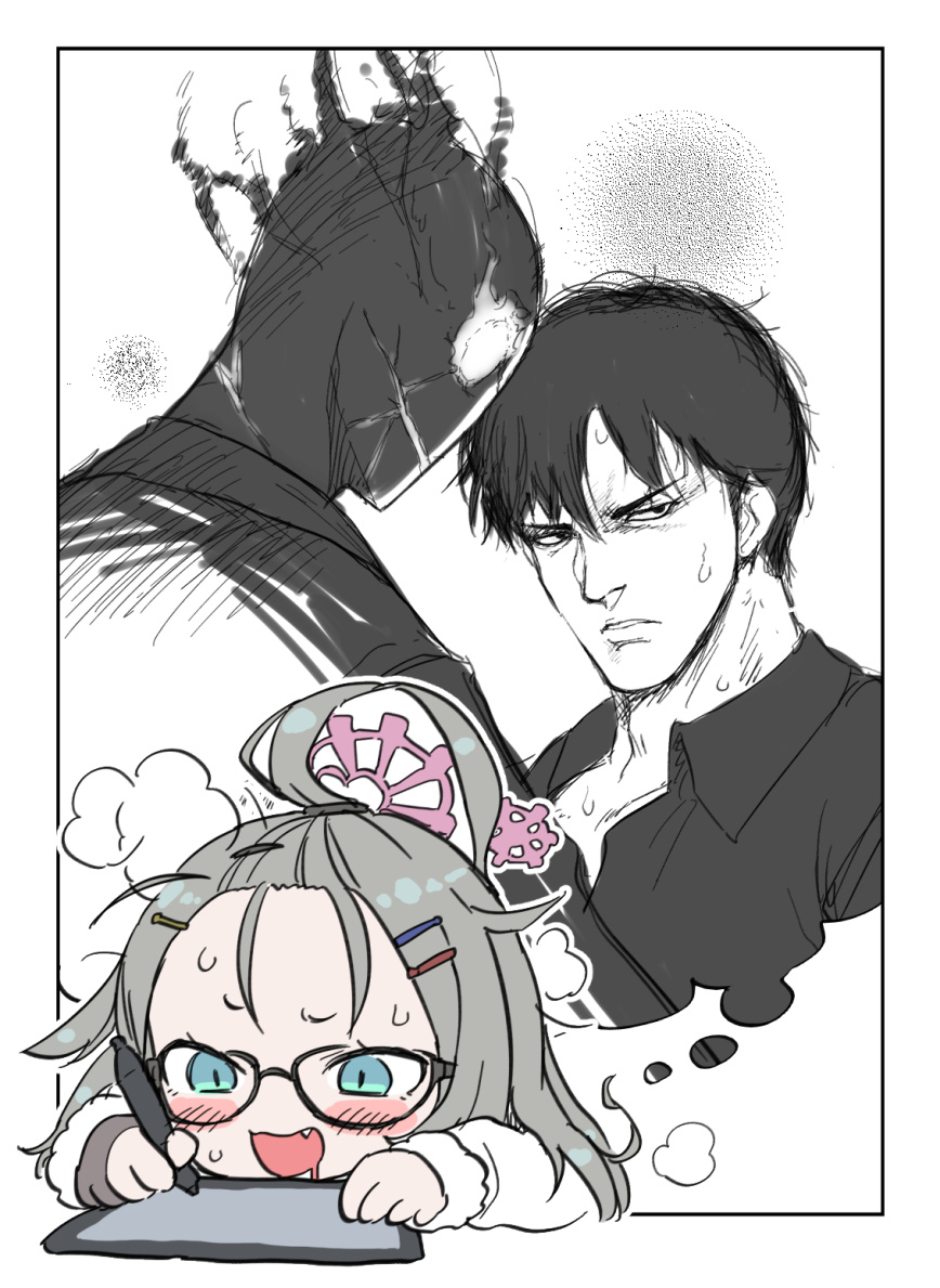 1girl 2boys ahoge bishounen black_suit_(blue_archive) blue_archive blue_eyes borrowed_design drawing_tablet drooling fang forehead glasses grey_hair halo heavy_breathing image_in_thought_bubble imagining kikai_(akita_morgue) long_hair meru_(blue_archive) messy_hair multiple_boys saliva sensei_(blue_archive) simple_background speech_bubble steam steaming_body stylus thought_bubble white_background