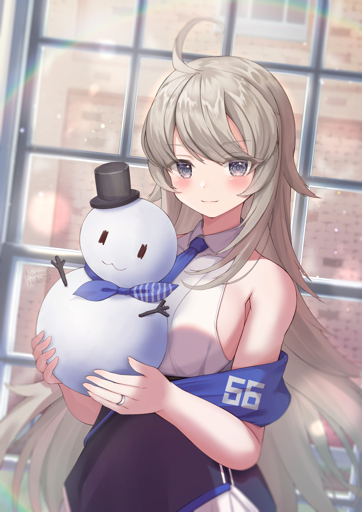 1girl ahoge blue_necktie breasts grey_eyes grey_hair hair_between_eyes highres holding_snowman jewelry kantai_collection large_breasts long_hair looking_at_viewer nazono_neko necktie ring smile snowman solo very_long_hair washington_(kancolle) wedding_ring