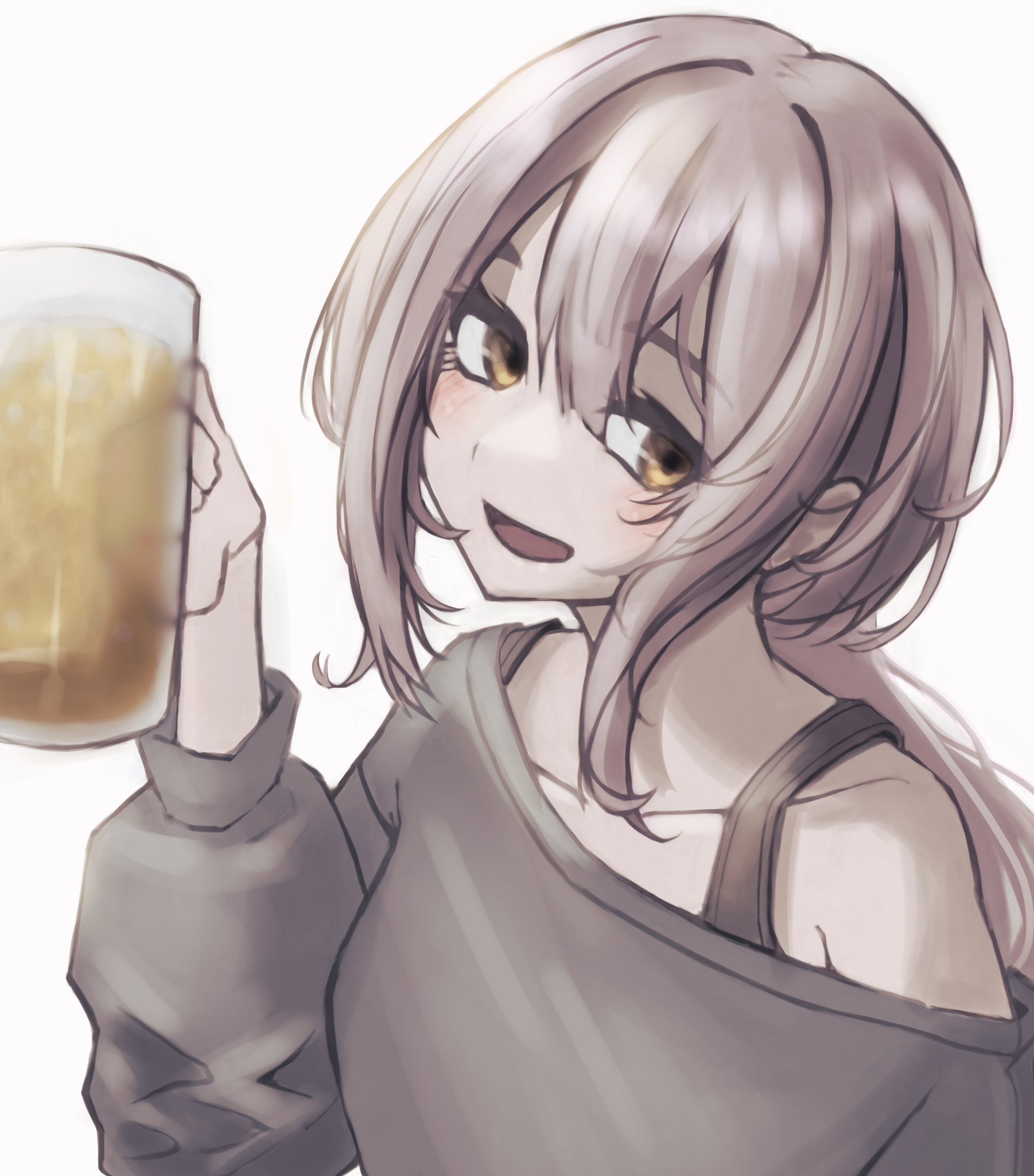 :d alternate_costume beer_mug black_shirt breasts casual collarbone cup eri_aki0827 goddess_of_victory:_nikke grey_hair grey_sweater highres holding light_blush long_hair medium_breasts mug off_shoulder open_mouth scarlet_(nikke) shirt smile sweater yellow_eyes