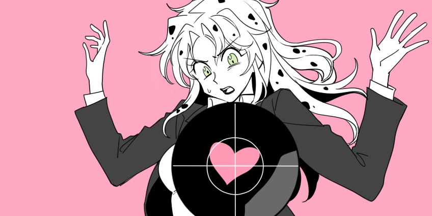 1girl breasts commentary_request crosshair diavolo genderswap genderswap_(mtf) green_eyes greyscale greyscale_with_colored_background heart jacket jojo_no_kimyou_na_bouken lipstick makeup medium_breasts monochrome pink_background sempon_(doppio_note) solo spot_color spotted_hair sweatdrop upper_body vento_aureo