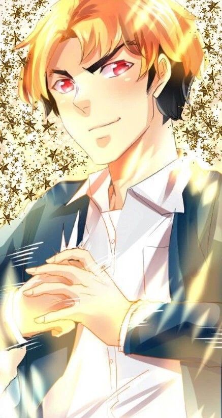 1boy blonde_hair blue_jacket closed_mouth isen_(unordinary) jacket looking_at_viewer red_eyes school_uniform shirt smile solo unordinary white_shirt
