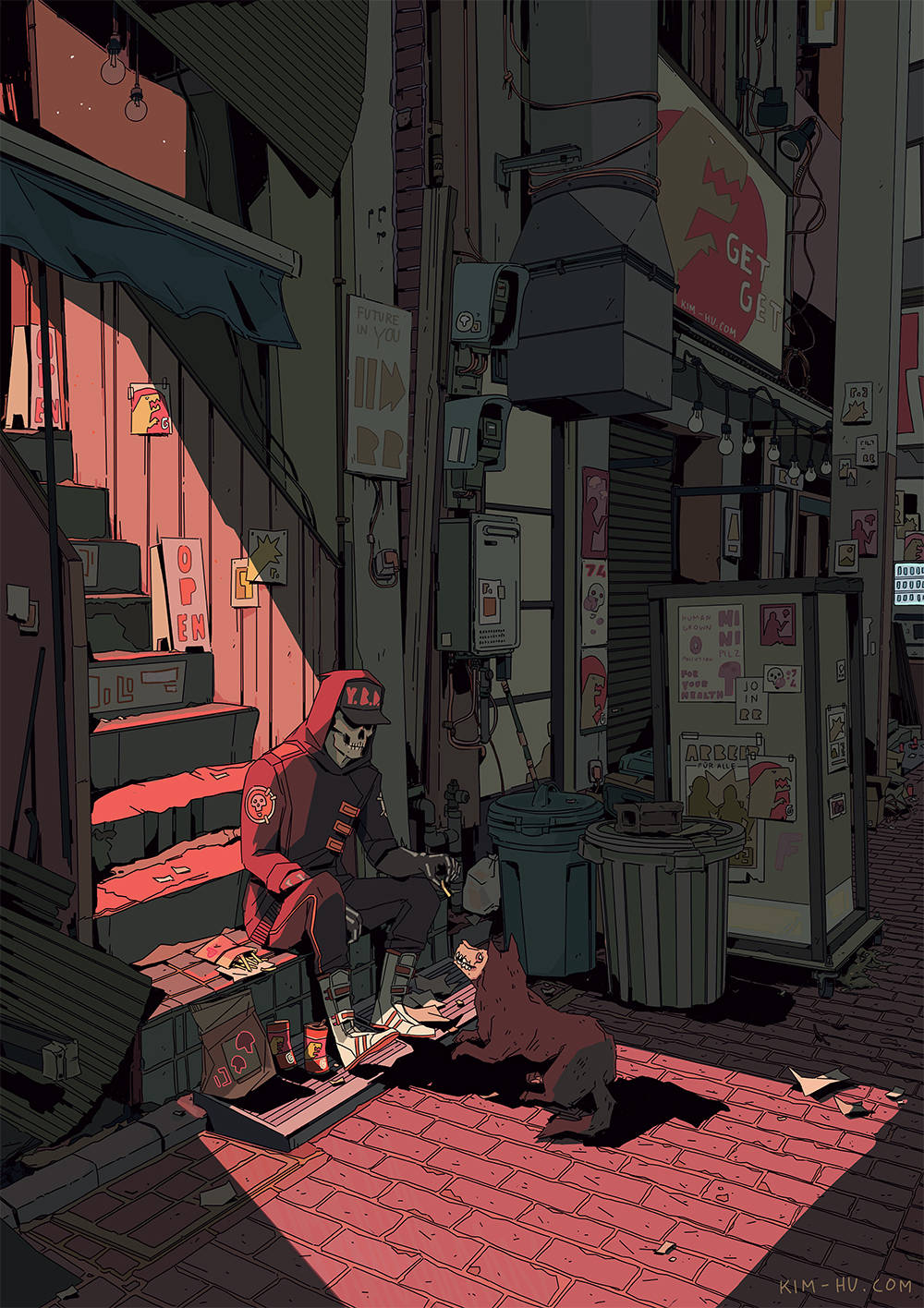 1boy alley baseball_cap billboard boots brick_road cable can commentary corrugated_galvanized_iron_sheet crack_of_light dog drink_can ductwork english_commentary food french_fries hanging_light hat highres holding holding_food hood hoodie kim_hu light_bulb long_sleeves looking_at_another night on_stairs original outdoors pants sharing_food sitting sitting_on_stairs skull stairs taped_note trash_can watermark web_address wide_shot