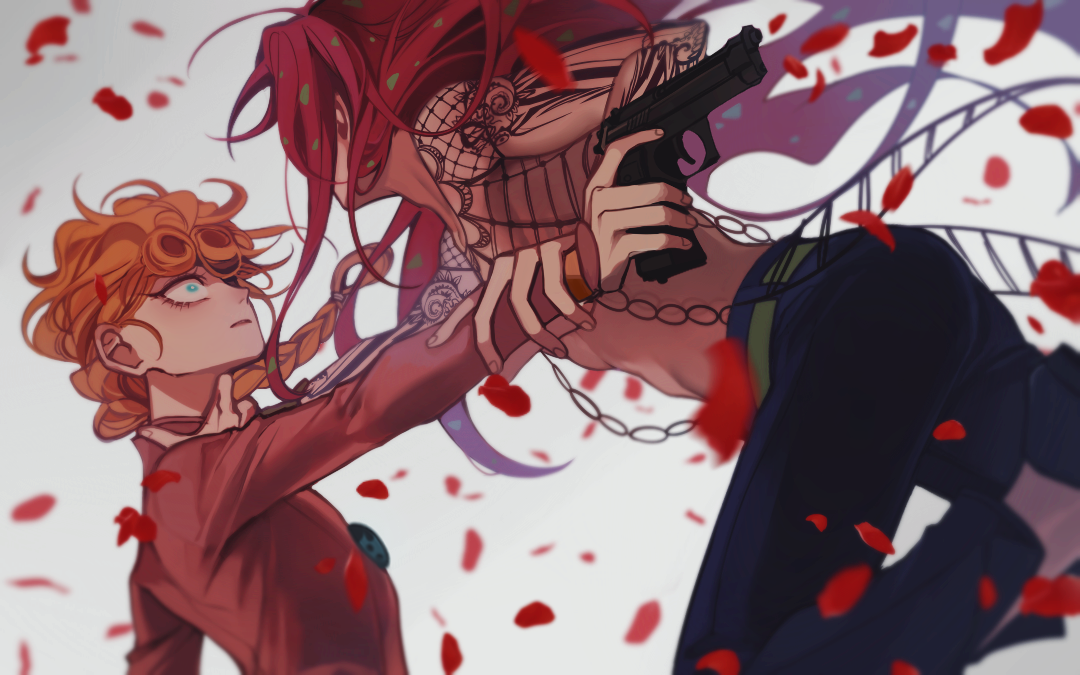 2boys belt beretta_92 blonde_hair blue_eyes braid braided_ponytail commentary_request constricted_pupils diavolo fishnet_top fishnets giorno_giovanna green_belt green_hair gun handgun holding holding_gun holding_weapon jojo_no_kimyou_na_bouken long_hair male_focus multicolored_hair multiple_boys pants petals pink_hair purple_pants sempon_(doppio_note) single_braid spotted_hair two-tone_hair vento_aureo weapon