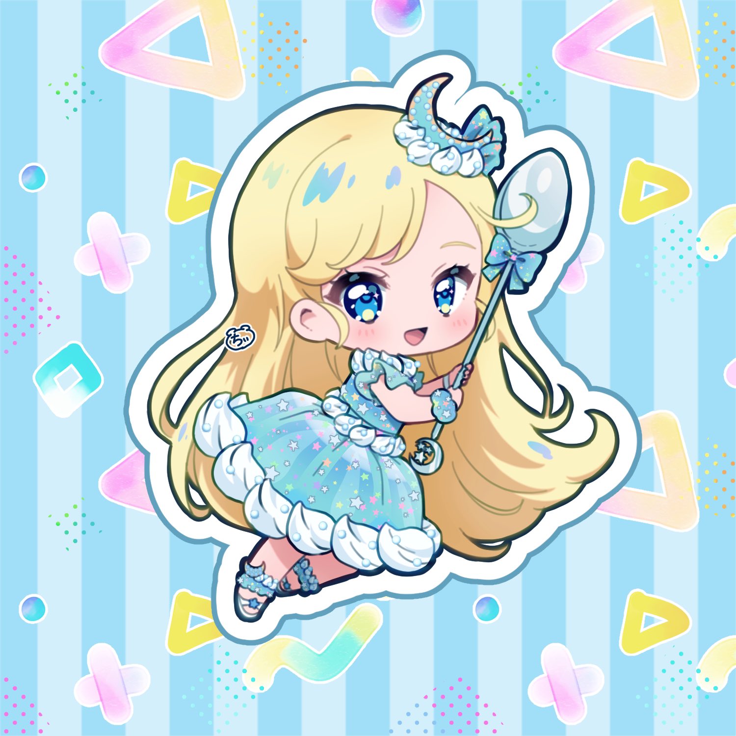 1girl :d blonde_hair blue_dress blue_eyes blue_shoes chibi chii_(chi_pppuri) commentary_request cream dress food food-themed_clothes full_body gelatin highres himitsu_no_aipri holding holding_spoon hoshikawa_mitsuki idol_clothes long_hair looking_at_viewer open_mouth outline pretty_series shoes signature smile solo spoon standing striped_background very_long_hair white_outline