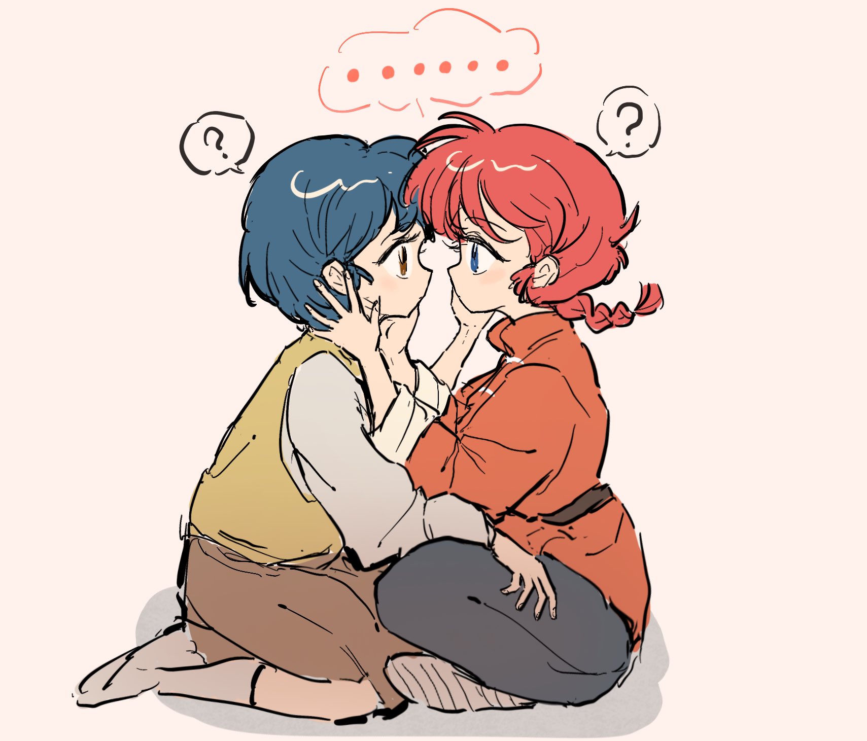2girls blue_eyes blue_hair braid braided_ponytail brown_eyes brown_skirt chinese_clothes couple danhuangcucu highres multiple_girls on_floor ranma-chan ranma_1/2 red_hair short_hair simple_background skirt tendou_akane yuri