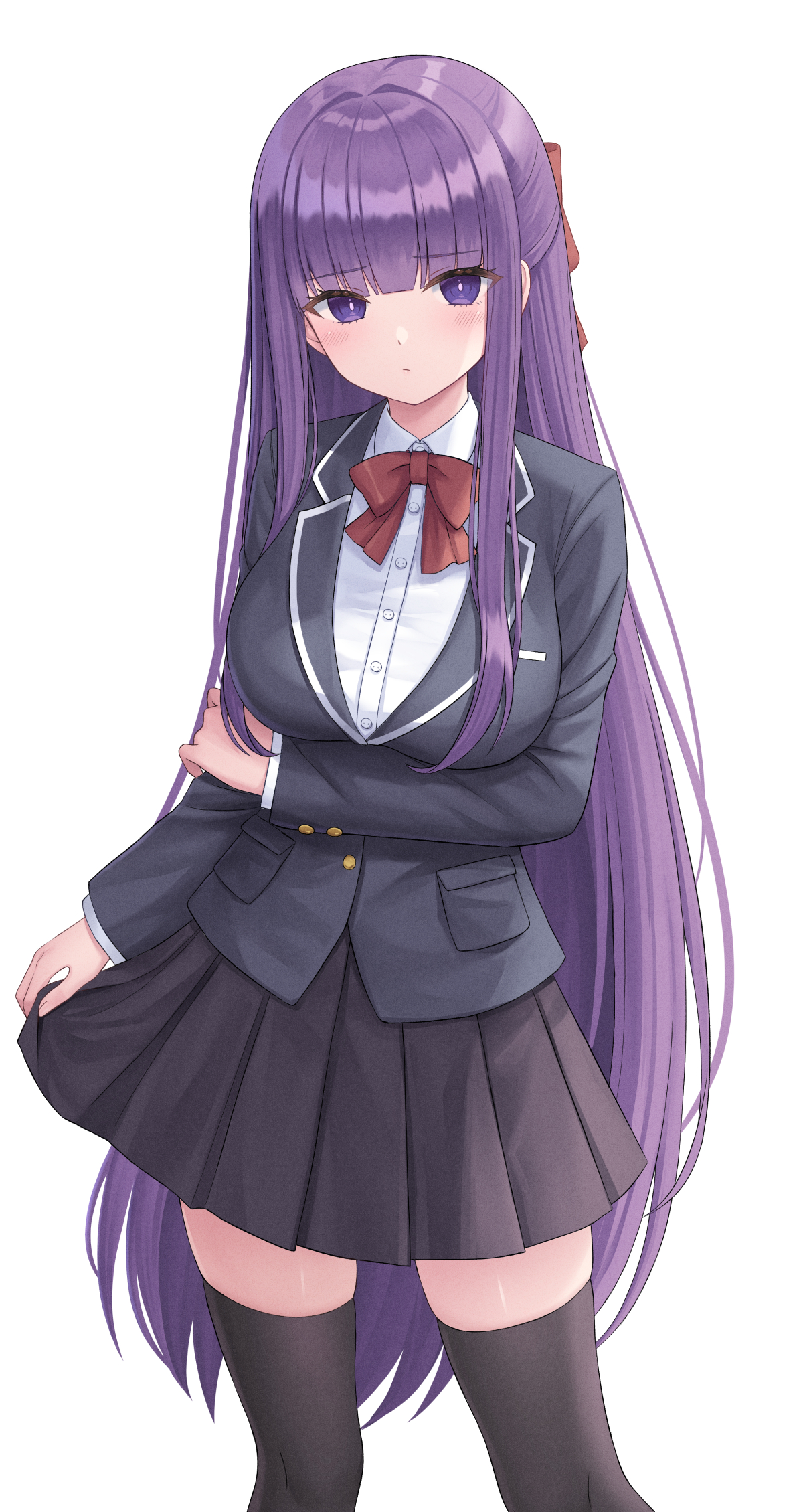 1girl alternate_costume arm_under_breasts black_jacket black_skirt black_thighhighs blazer blunt_bangs bow bowtie breasts closed_mouth collar collared_shirt commentary_request fern_(sousou_no_frieren) highres jacket large_breasts long_hair long_sleeves looking_at_viewer purple_eyes purple_hair red_bow red_bowtie school_uniform seungju_lee shirt simple_background skirt solo sousou_no_frieren standing thighhighs white_background white_collar white_shirt zettai_ryouiki