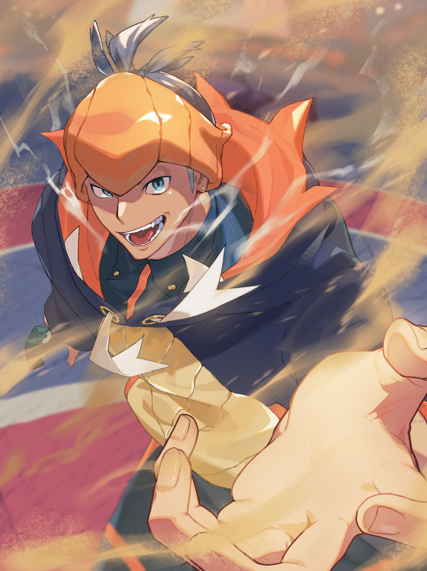 1boy black_hoodie collared_shirt commentary_request earrings gloves green_eyes gunjo_shizuko headband highres hood hood_down hoodie jewelry male_focus nintendo open_mouth orange_headband partially_fingerless_gloves pokemon pokemon_sword_and_shield raihan_(pokemon) sandstorm_(pokemon) shirt short_hair single_glove solo teeth tongue