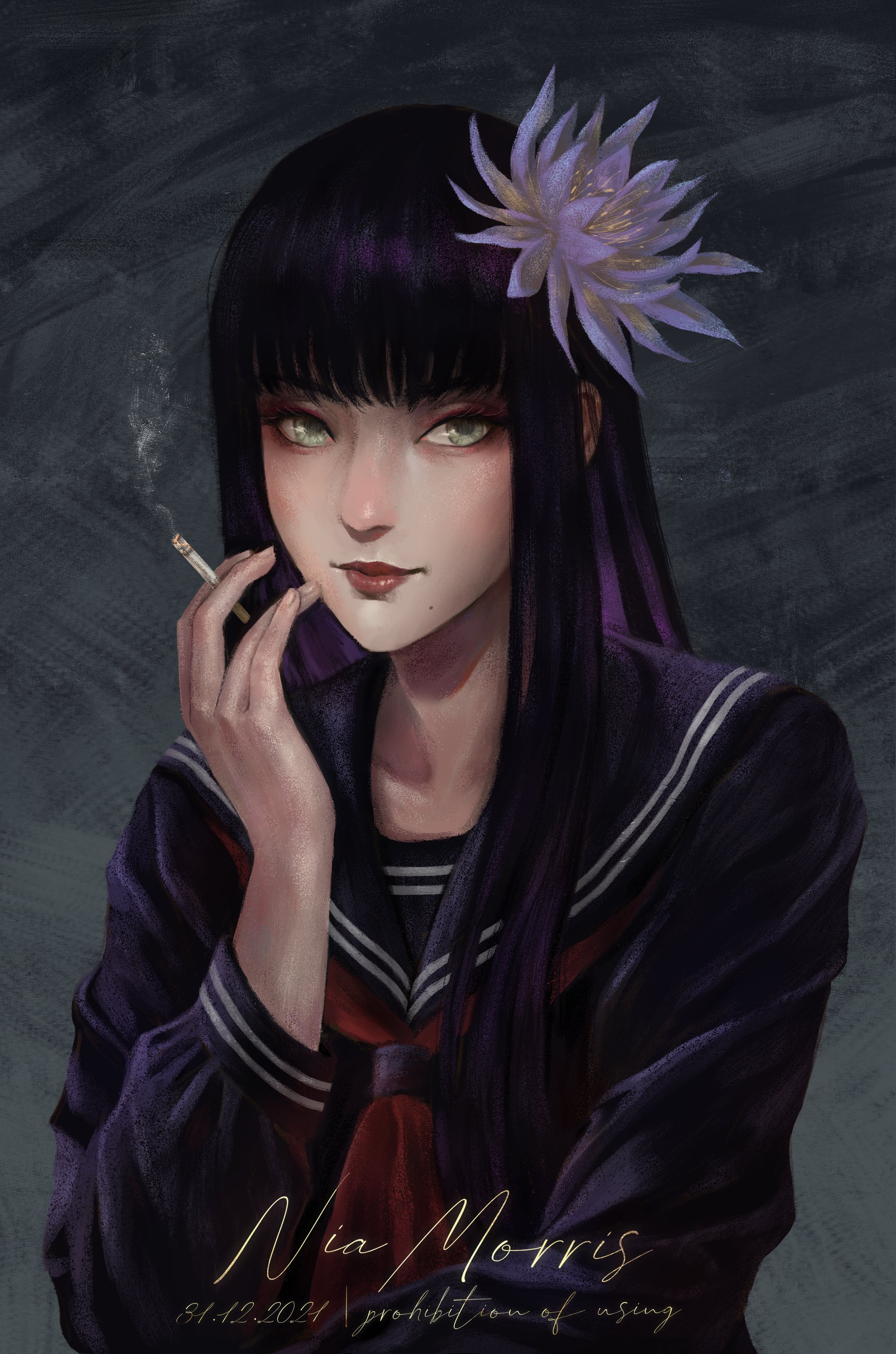 1girl absurdres artist_name between_fingers black_hair black_jacket cigarette collarbone contemporary dated eyeshadow final_fantasy final_fantasy_xiv flower green_eyes grey_background hair_flower hair_ornament hand_up highres holding jacket light_smile long_hair long_sleeves looking_at_viewer makeup mole mole_under_mouth neckerchief niamorris54 official_alternate_costume realistic red_eyeshadow red_neckerchief sailor_collar school_uniform serafuku signature simple_background smoke solo straight_hair upper_body white_flower yotsuyu_goe_brutus