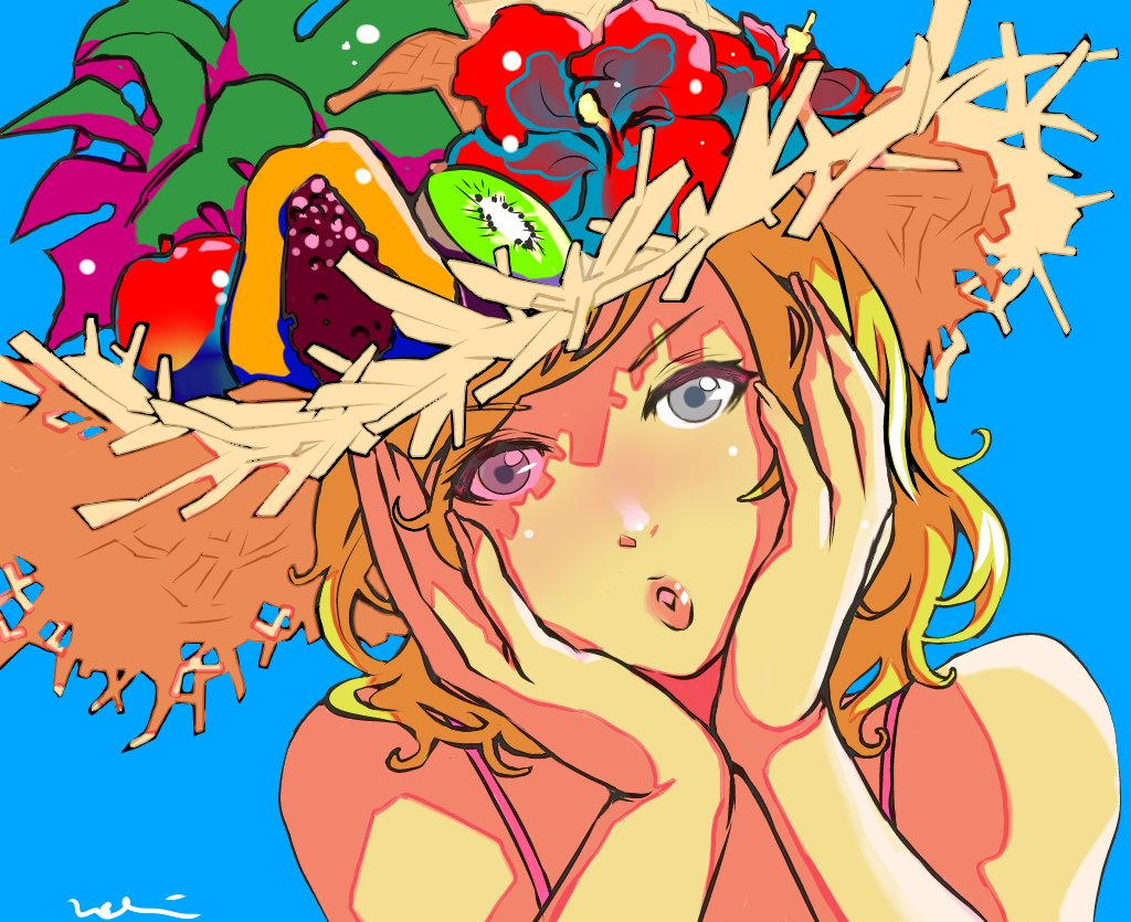 1girl ashelia_b'nargin_dalmasca blonde_hair blue_eyes final_fantasy final_fantasy_xii flower food fruit hands_on_own_face hat hat_flower lips long_hair looking_at_viewer mochi_(hanamaruudondesu) portrait puckered_lips simple_background solo straw_hat