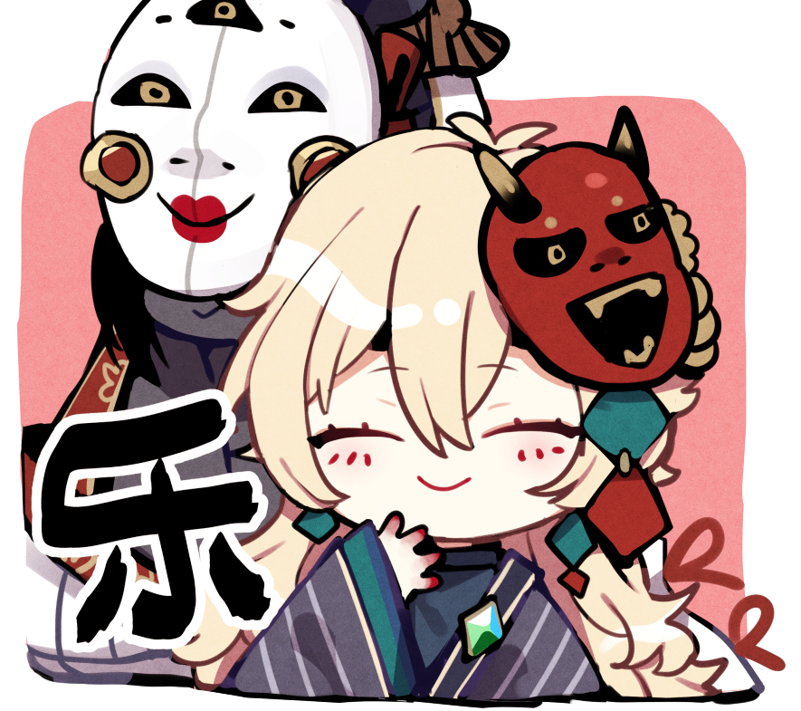 1boy bishounen black_haori black_shirt black_skin blonde_hair border chibi closed_eyes closed_mouth colored_skin eye_tattoo facial_mark facing_viewer hair_between_eyes hand_up hannya_(onmyoji) hannya_mask haori horned_mask japanese_clothes light_blush long_hair long_sleeves male_focus mask mask_on_head moto_mitsuashi oni_mask onmyoji red_background red_mask shirt simple_background smile solo_focus striped_clothes striped_haori tagme tattoo facial_tattoo tattoo_under_eye translation_request trap turtleneck upper_body vengeful_hannya_(onmyoji) very_long_hair white_border white_mask