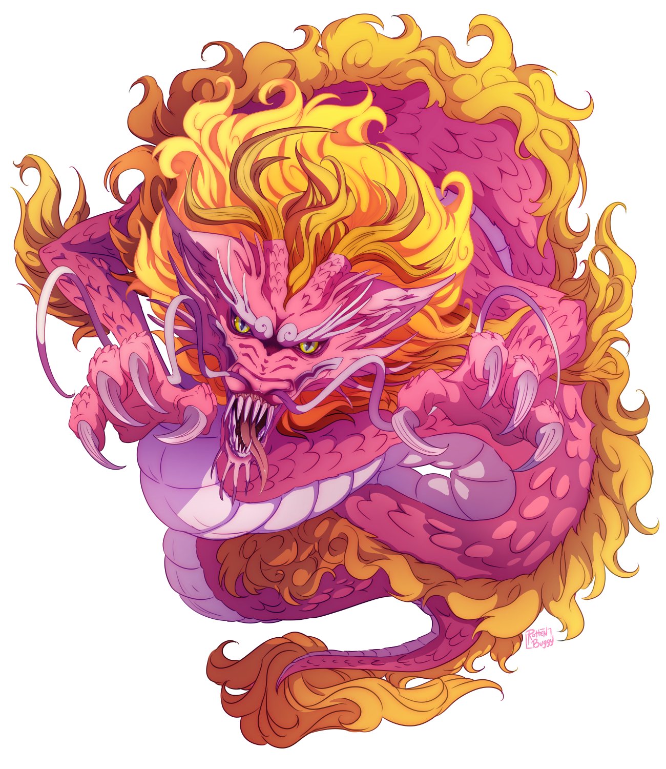 1boy alternate_form artist_name boneheadbuggy claws commentary dragon dragon_boy dragon_horns english_commentary full_body highres horns kouzuki_momonosuke looking_at_viewer male_focus one_piece open_mouth sharp_teeth signature simple_background solo teeth tongue tongue_out white_background