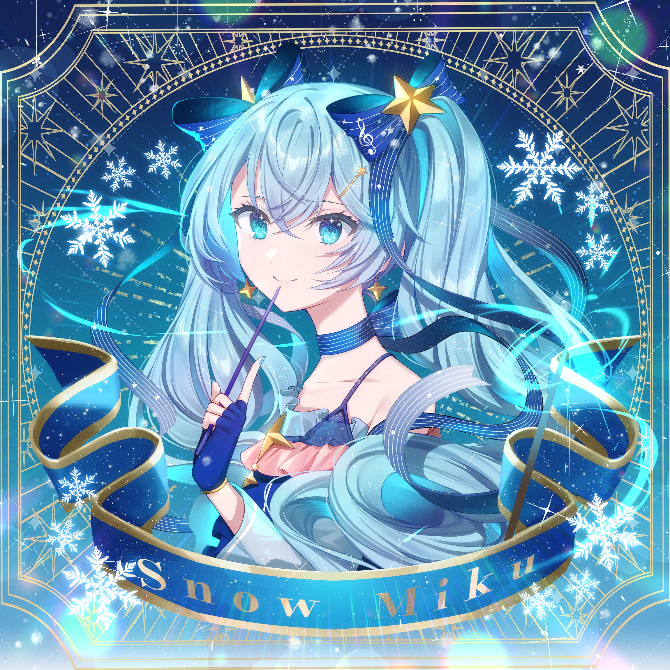 1girl blue_bow blue_eyes blue_gloves blue_hair blue_nails blue_ribbon bow character_name choker closed_mouth collarbone fingerless_gloves gloves hair_between_eyes hair_bow hair_ornament hatsune_miku highres holding holding_wand lushuao nail_polish ribbon ribbon_choker short_hair smile snowflakes solo star_(symbol) star_hair_ornament striped_bow striped_ribbon twintails upper_body vocaloid wand yuki_miku yuki_miku_(2017)