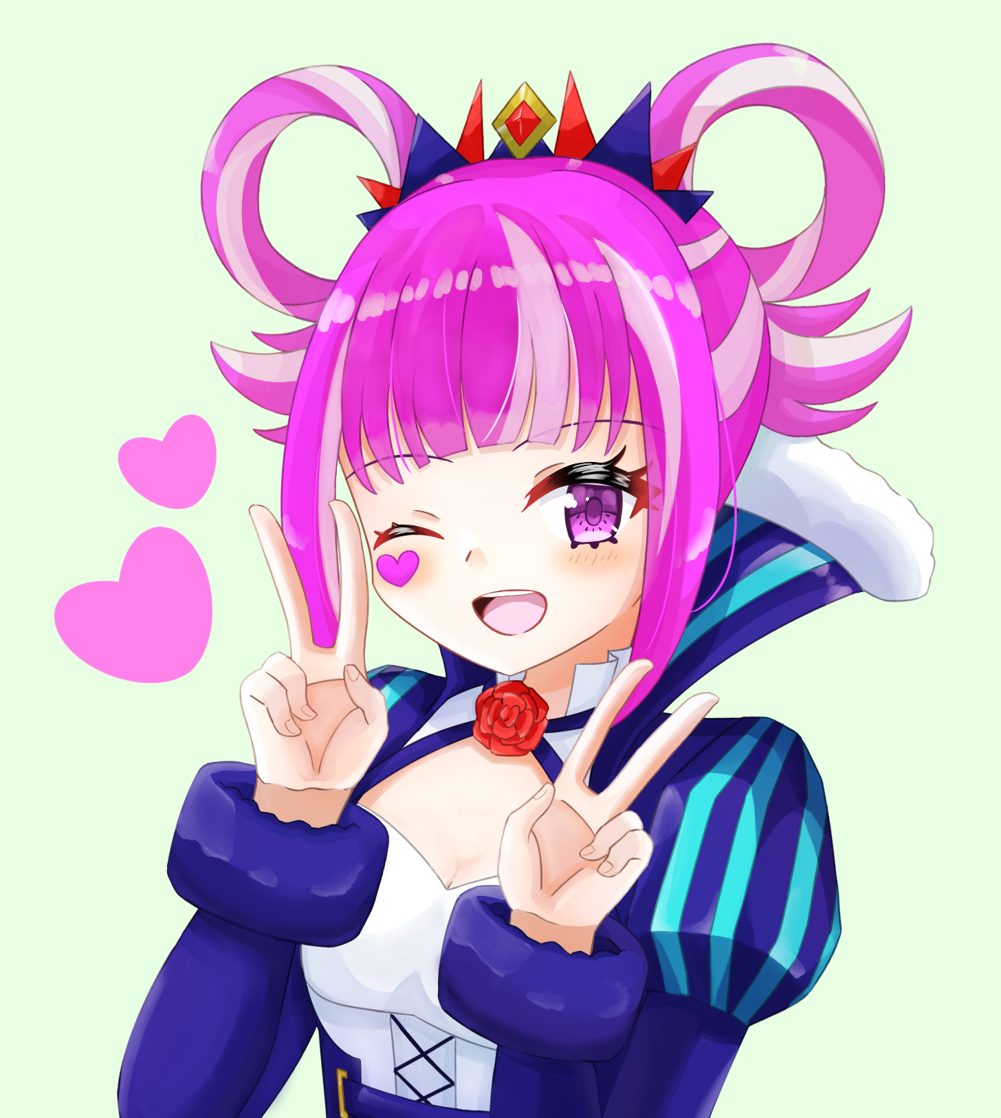1girl cross-laced_clothes cross-laced_dress double_v dress facial_mark fire_emblem fire_emblem_engage folded_twintails hair_flaps heart heart_facial_mark highres hime_cut hortensia_(fire_emblem) nintendo pink_eyes pink_hair setuna_cxxxvll striped_clothes striped_dress v vertical-striped_clothes vertical-striped_dress